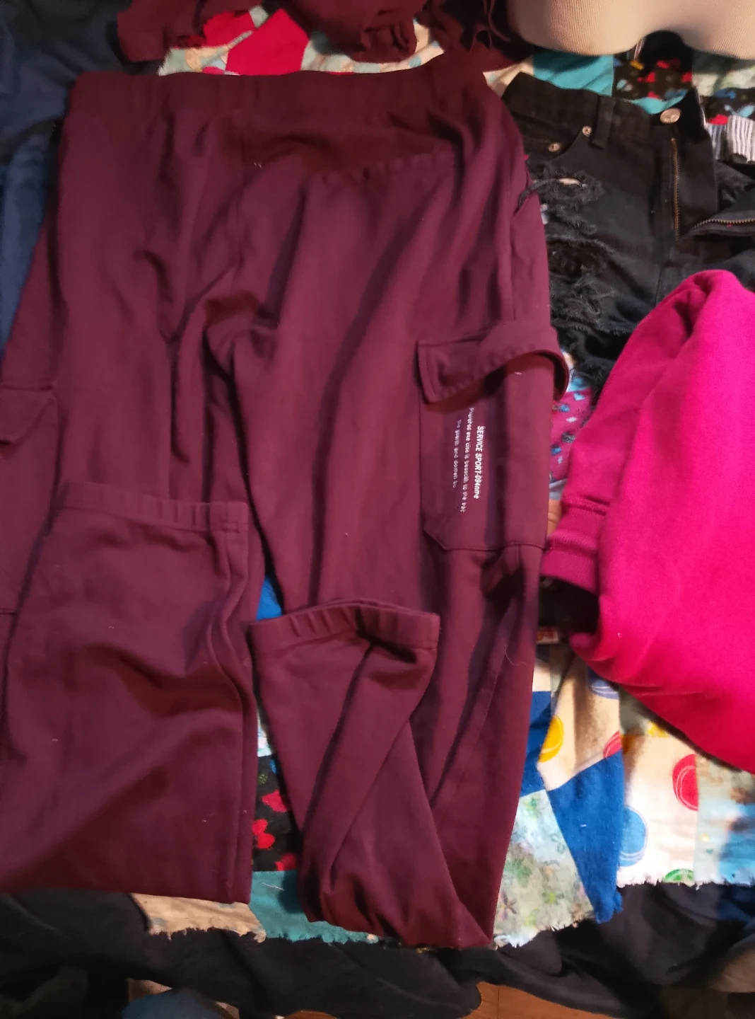 Maroon cargo pants with an elastic waistband and drawstring. Features multiple pockets and a comfortable fit. Perfect for casual wear. Statement t-shirt large cargo pants xl
