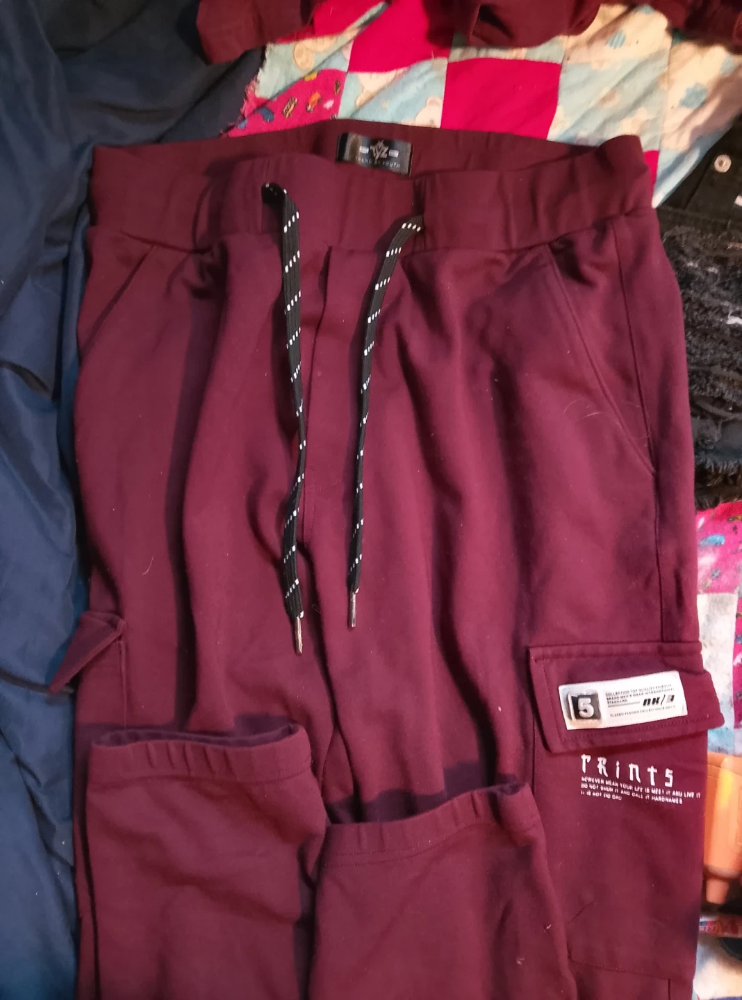Maroon cargo pants with an elastic waistband and drawstring. Features multiple pockets and a comfortable fit. Perfect for casual wear. Statement t-shirt large cargo pants xl