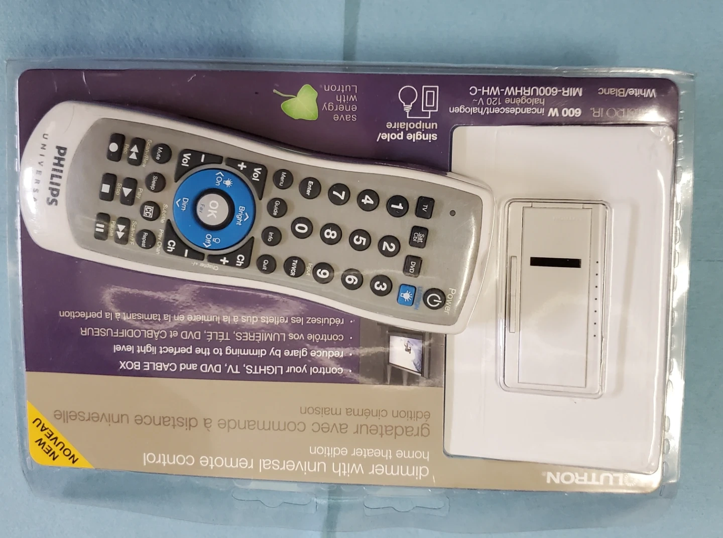 This kit includes a Lutron Universal Remote Control and a dimmer. The remote's designed for controlling lights, TVs, DVD, and cable boxes. It's a home theatre edition that saves energy and extends bulb life.