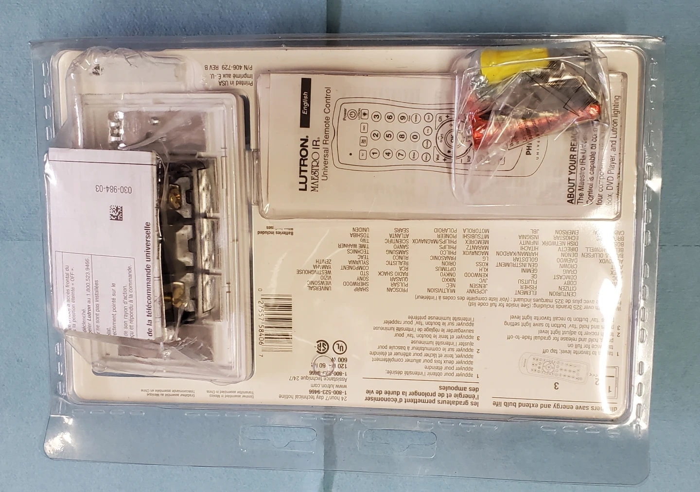 This kit includes a Lutron Universal Remote Control and a dimmer. The remote's designed for controlling lights, TVs, DVD, and cable boxes. It's a home theatre edition that saves energy and extends bulb life.