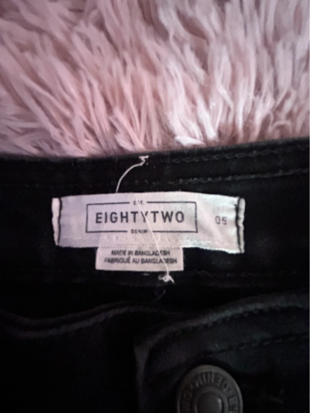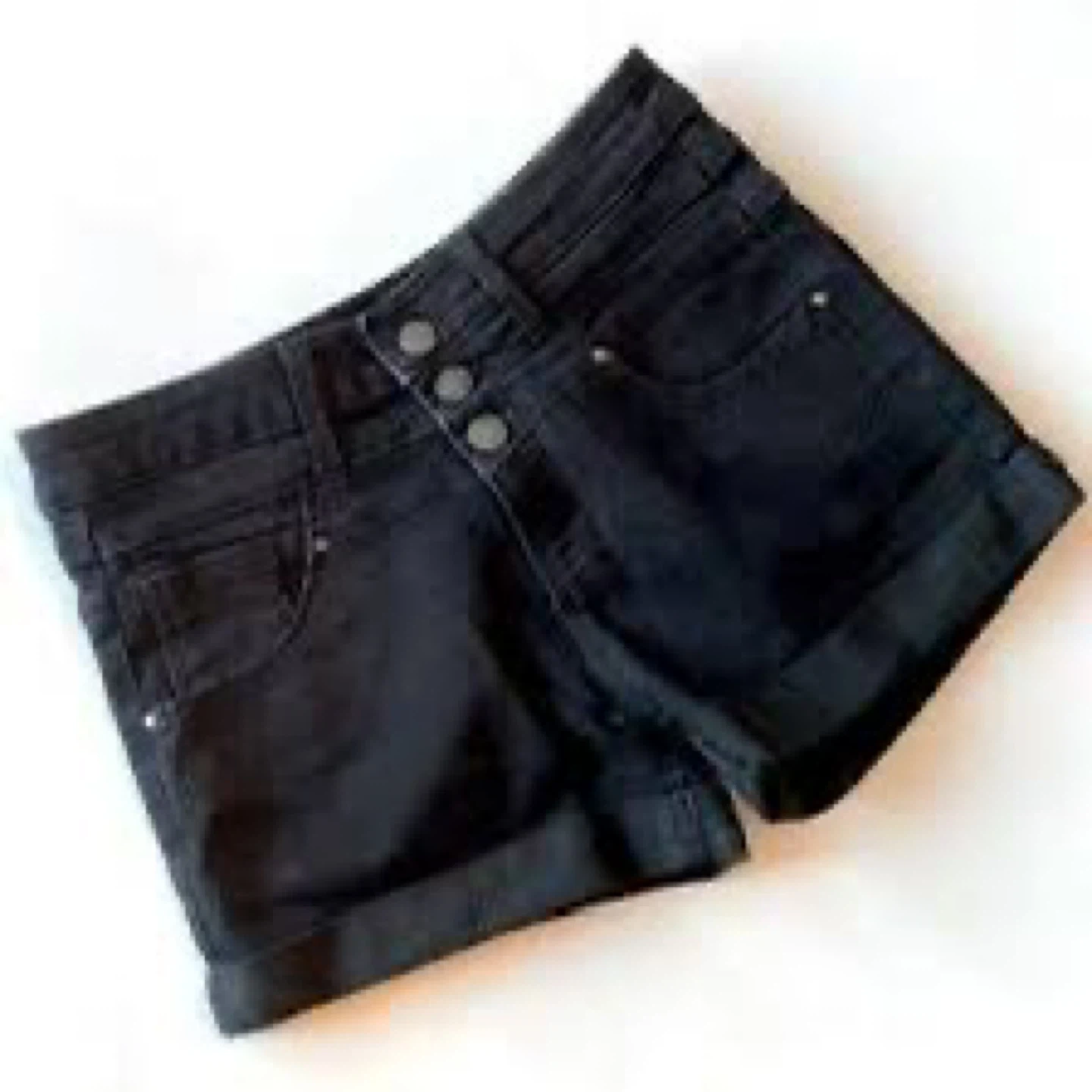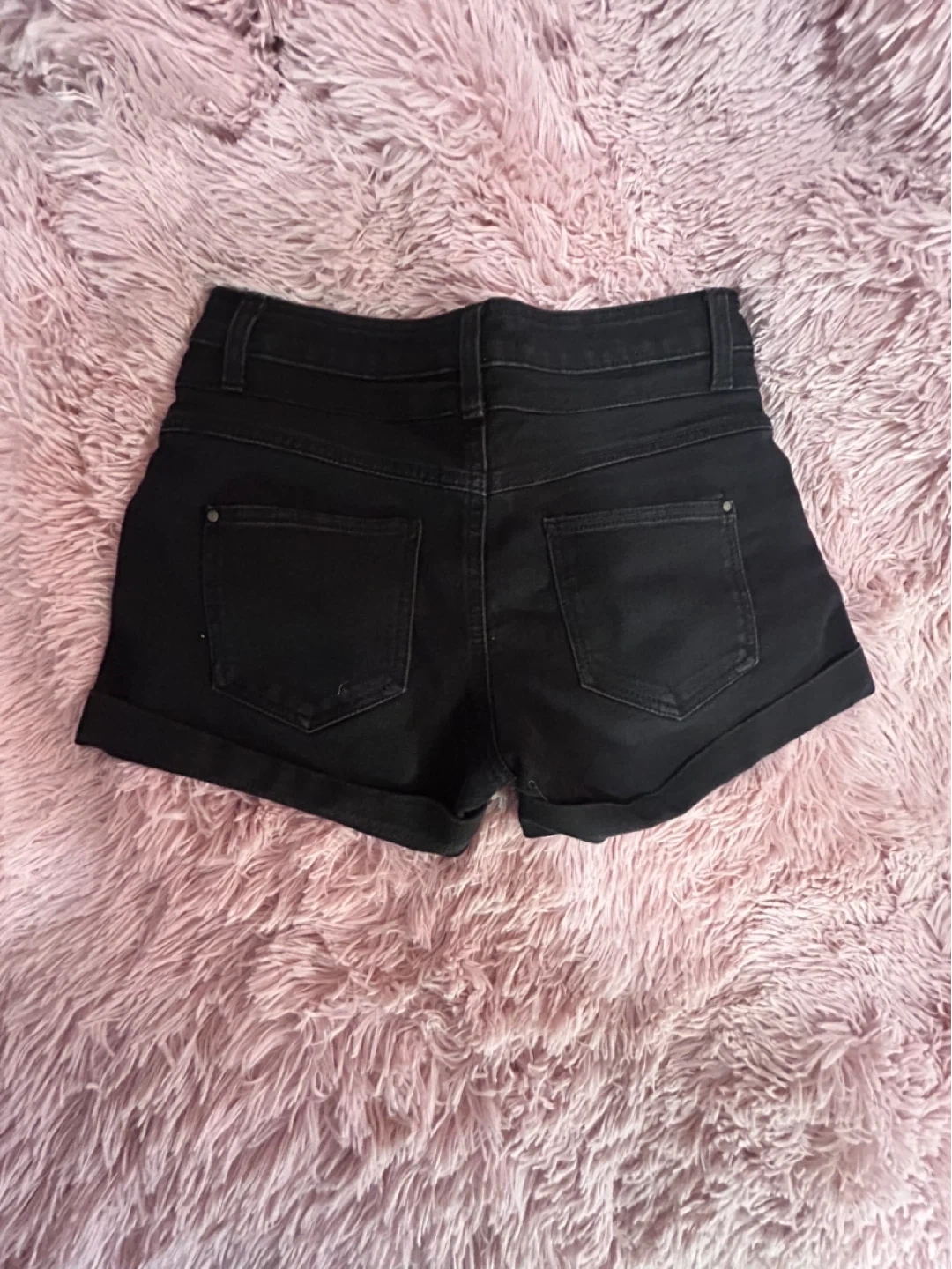 These are black denim shorts from Eighty Two. They feature a cuffed hem and a button-fly closure. Made from denim material.
