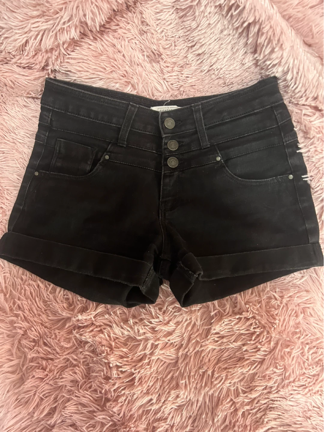 These are black denim shorts from Eighty Two. They feature a cuffed hem and a button-fly closure. Made from denim material.