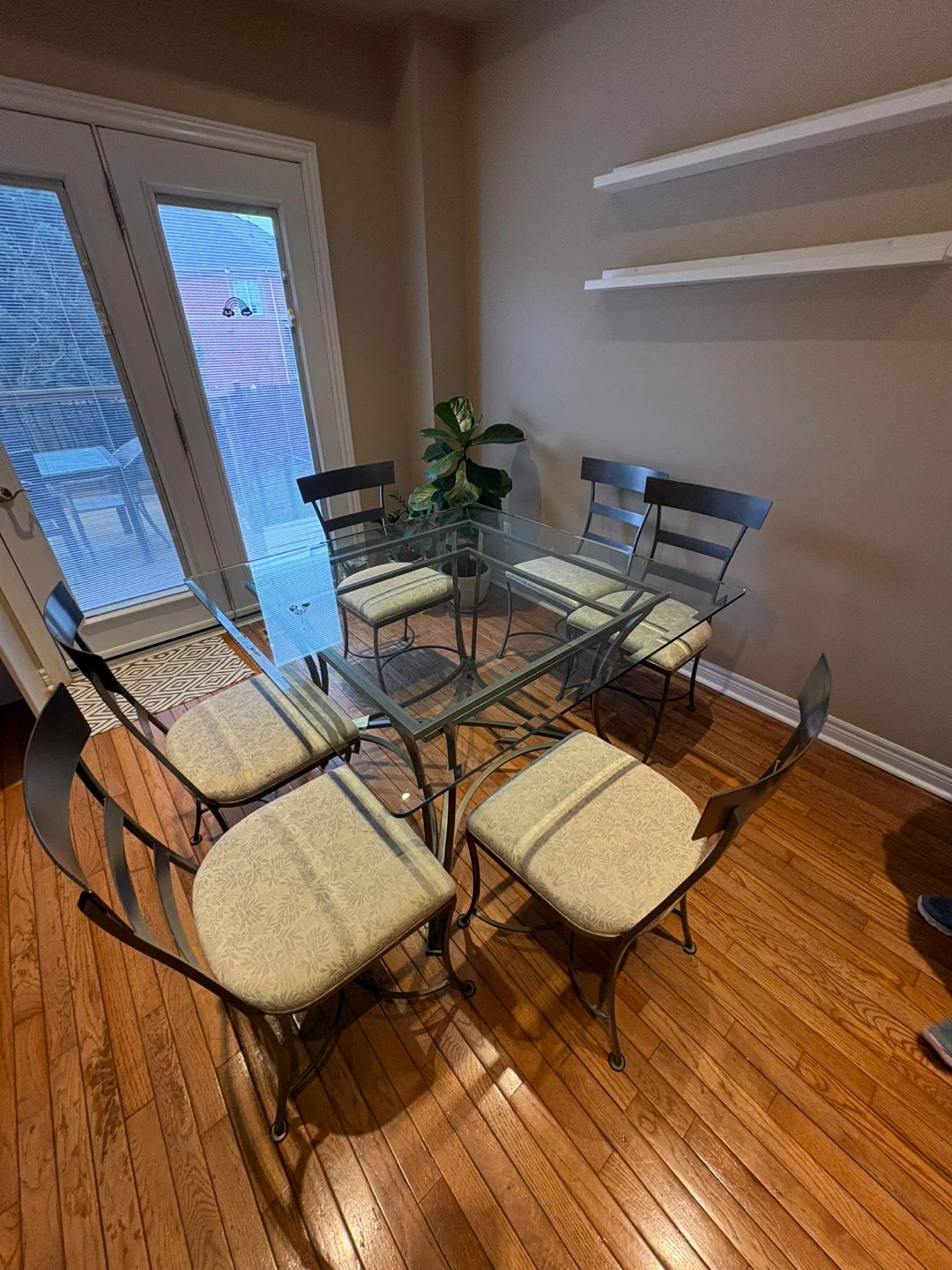 Wrought Iron custom Glass Top Dining Table with 6 Fabric Chairs