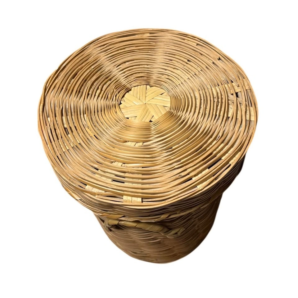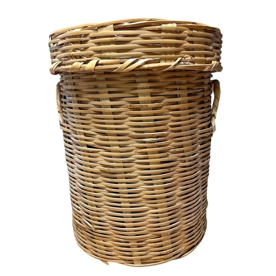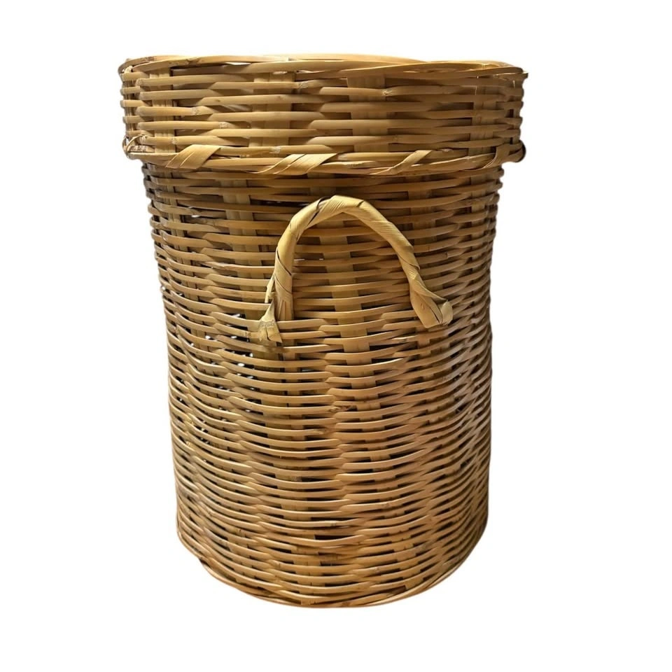 Great condition - might just be a little dusty. Basket has lid and could be used for storage of small blankets or clothes etc. 17" tall x 12" diameter. Pond Mills.