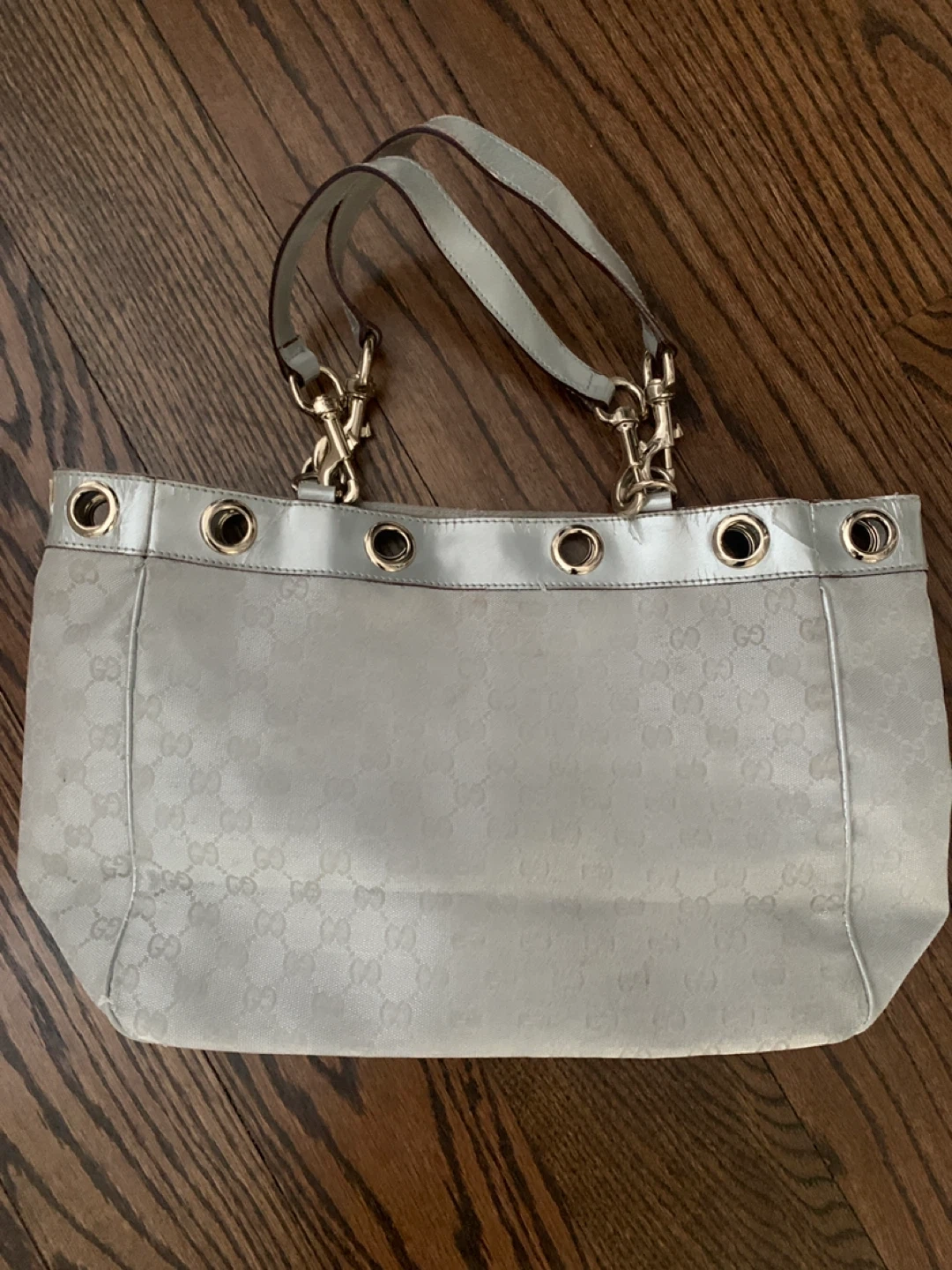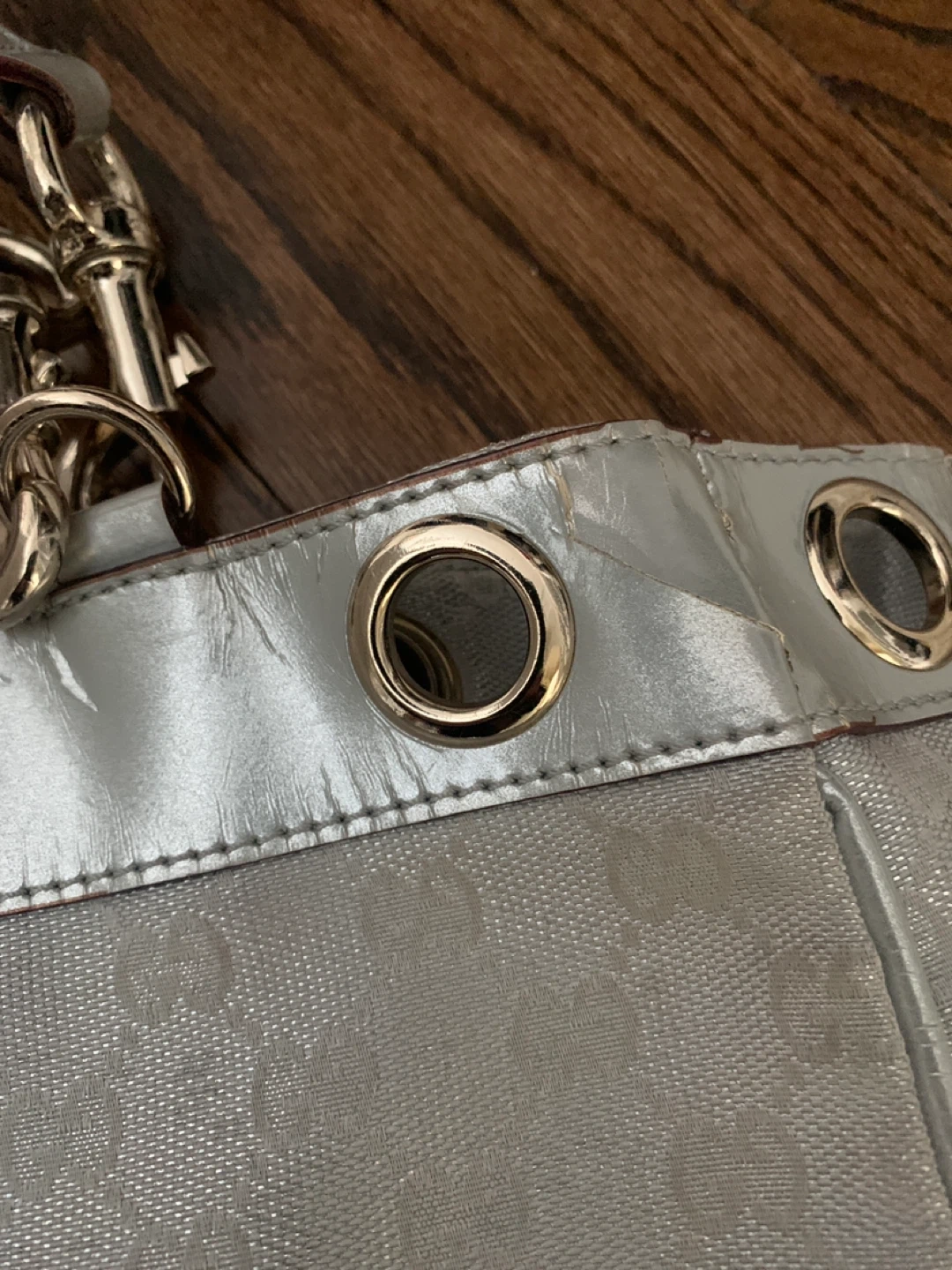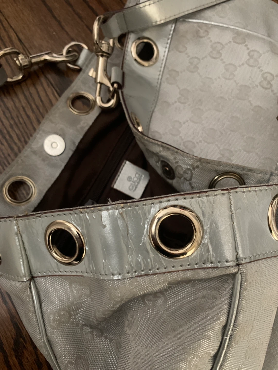 This is a light grey Gucci shoulder bag with the signature GG monogram pattern. It's made from a coated canvas and features patent leather trim with gold-tone eyelets. The interior is lined with brown fabric and has a zippered pocket. This bag is great for everyday use. As you can see some damage on leather part , sign of again but no damage on fabric.