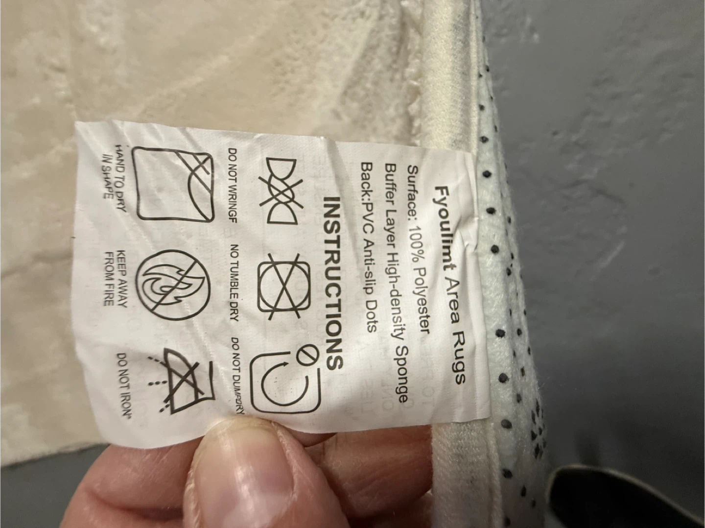 This Fyoulimt area rug has a surface made of 100% polyester. The back is PVC with anti-slip dots. It's a soft and comfortable addition to any room.