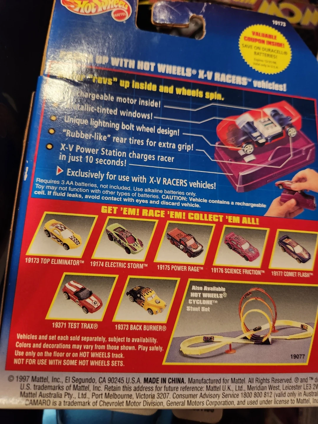 This Hot Wheels X-V Racers vehicle features a rechargeable motor and lightning bolt design. It's designed for X-V Power Stations and charges in just 10 seconds. The car has unique bolt design wheels and metallic-tinted windows.