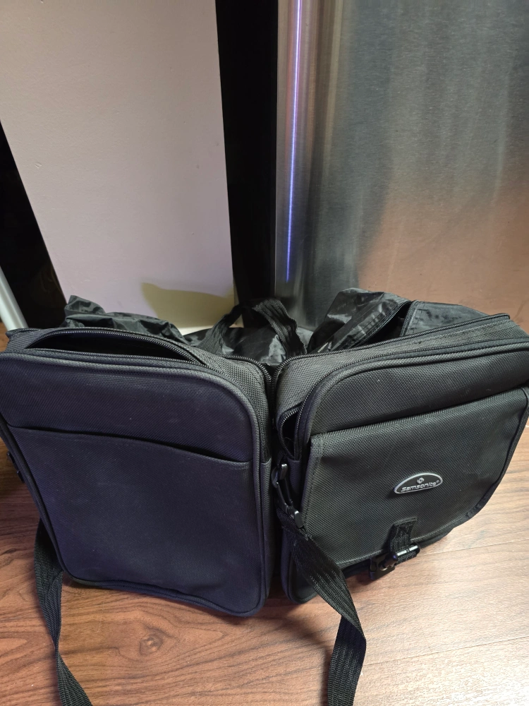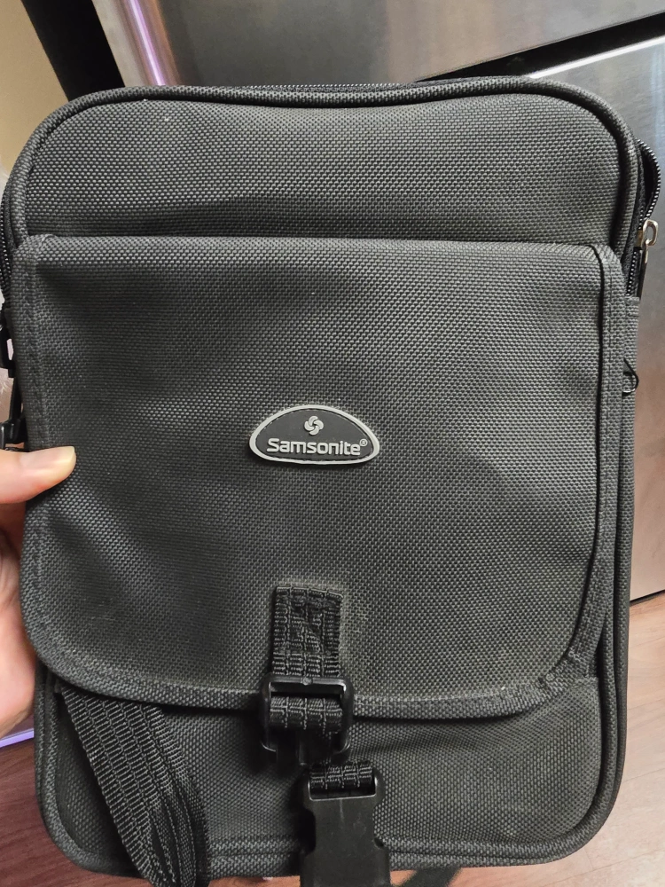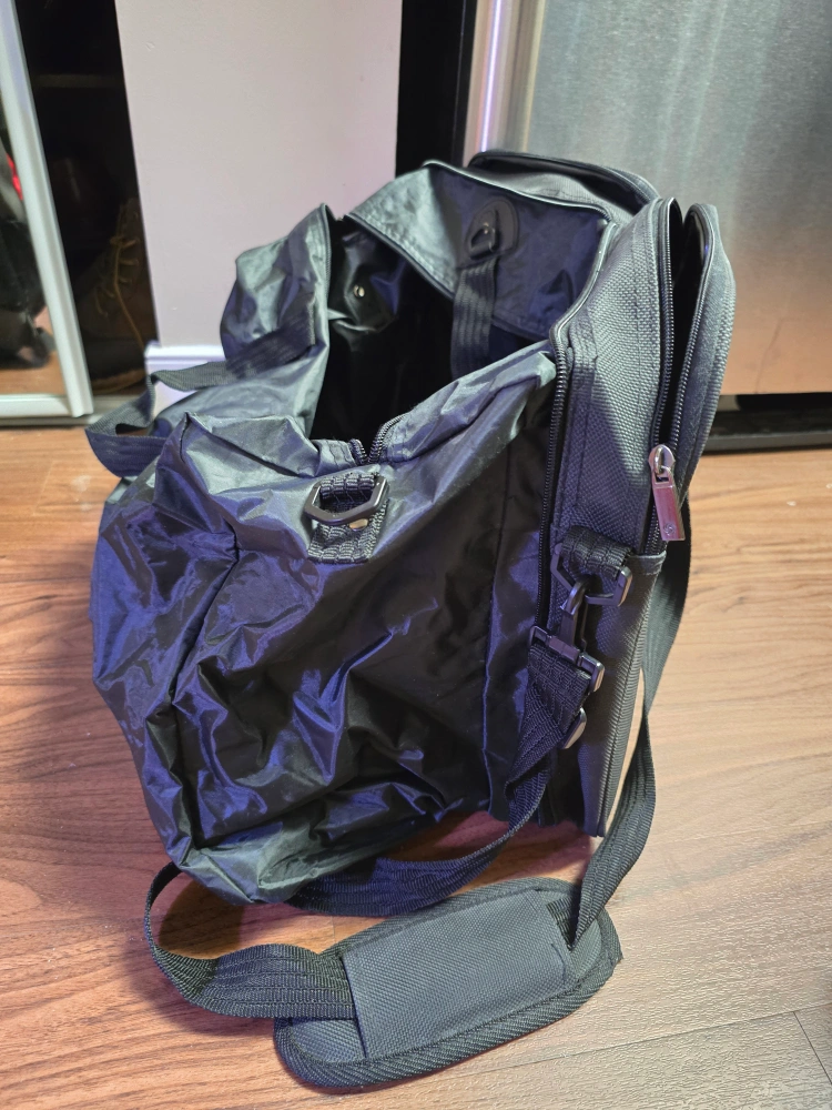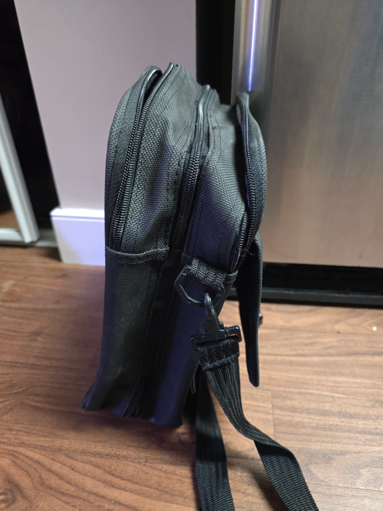 Black messenger bag with adjustable shoulder strap. Has two main compartments with a zipper closure, and an additional small zippered pouch on the front. converts to a duffle bag