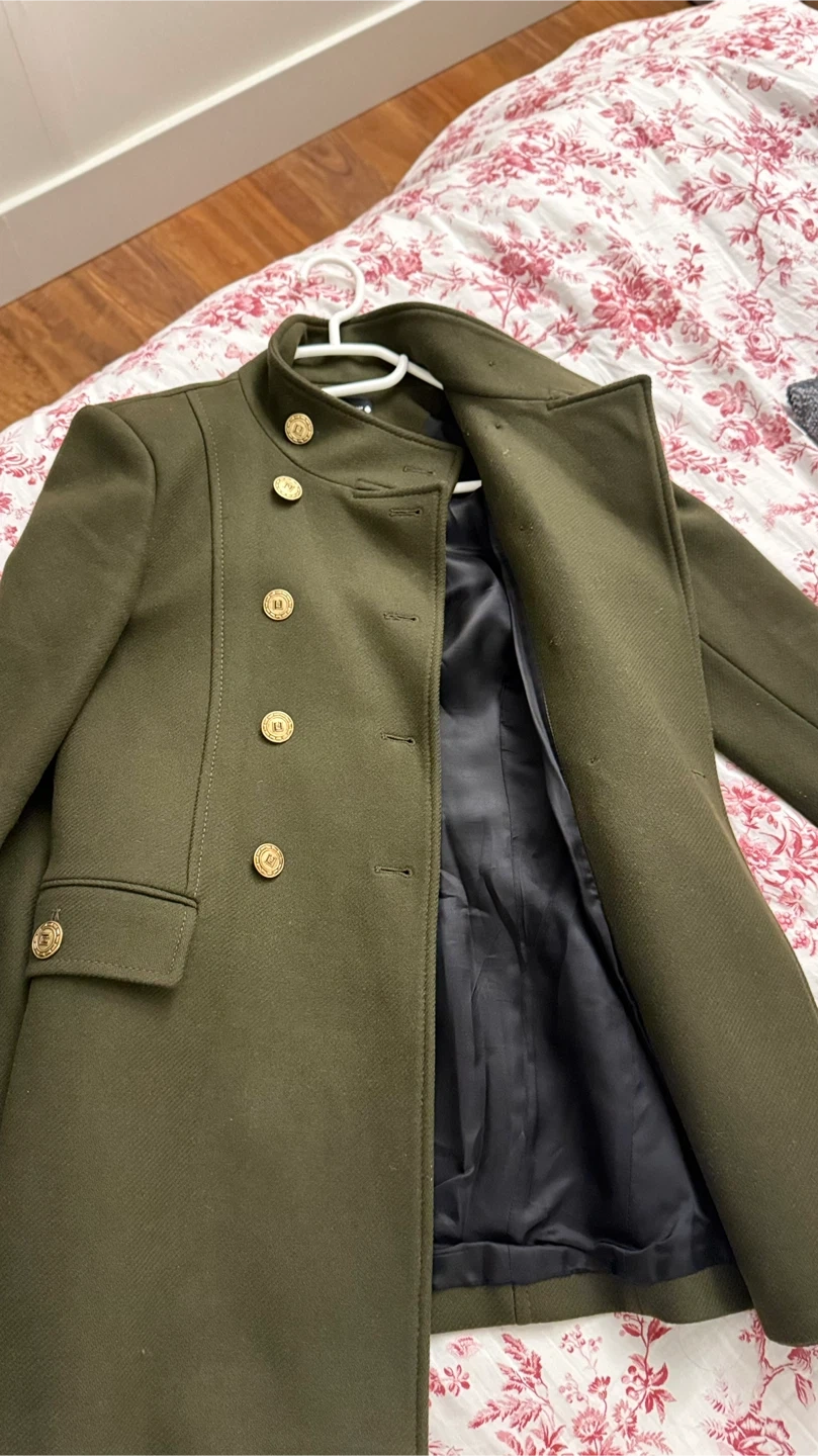 A stylish Zara double-breasted coat in a deep olive green colour. It's designed with a military-inspired aesthetic, featuring gold-tone buttons and a structured collar. This coat is perfect for cooler weather, offering both warmth and a fashionable statement. Material feels like a wool blend.