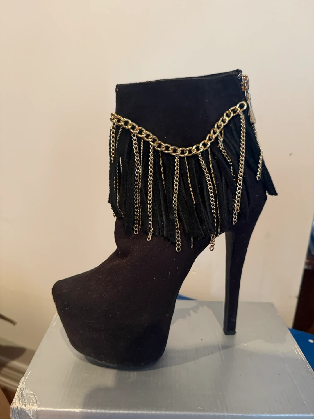 Stylish black ankle boots with a suede-like finish. They feature a thick gold chain accent with dangling fringe detail across the vamp. A side zipper ensures easy on and off. These boots have a high stiletto heel and a platform sole.