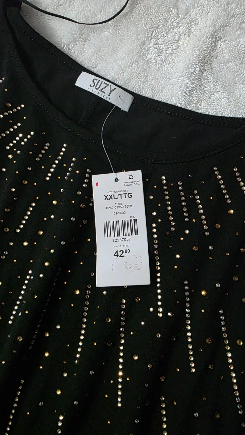 This black long-sleeve top from Suzy is embellished with sparkly rhinestones. It's a size XXL/TTG. Perfect for adding a touch of glam to your outfit!