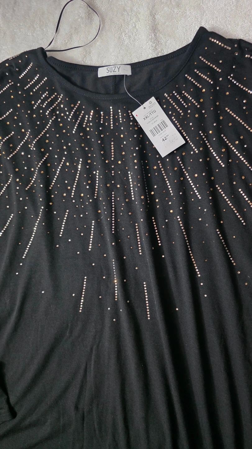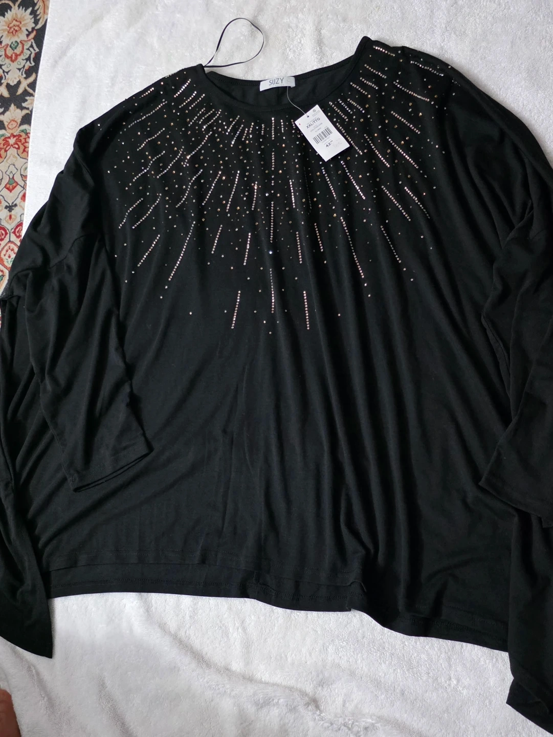 This black long-sleeve top from Suzy is embellished with sparkly rhinestones. It's a size XXL/TTG. Perfect for adding a touch of glam to your outfit!