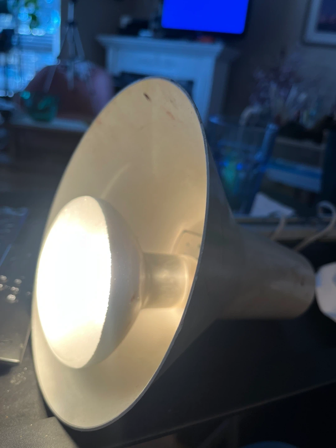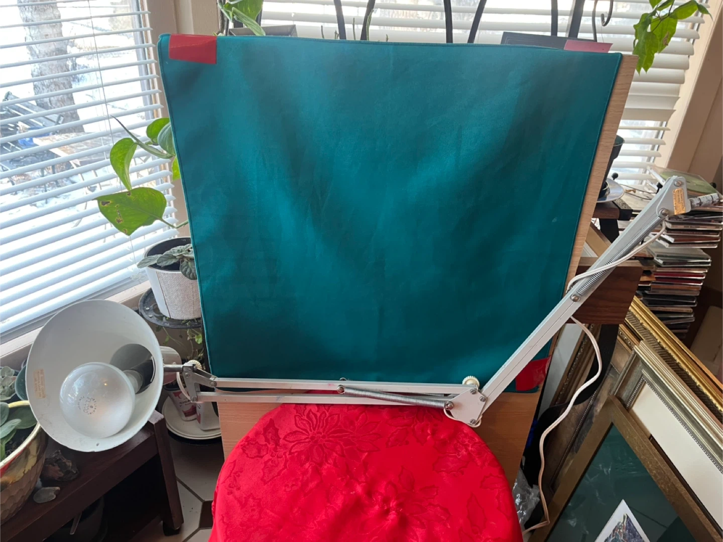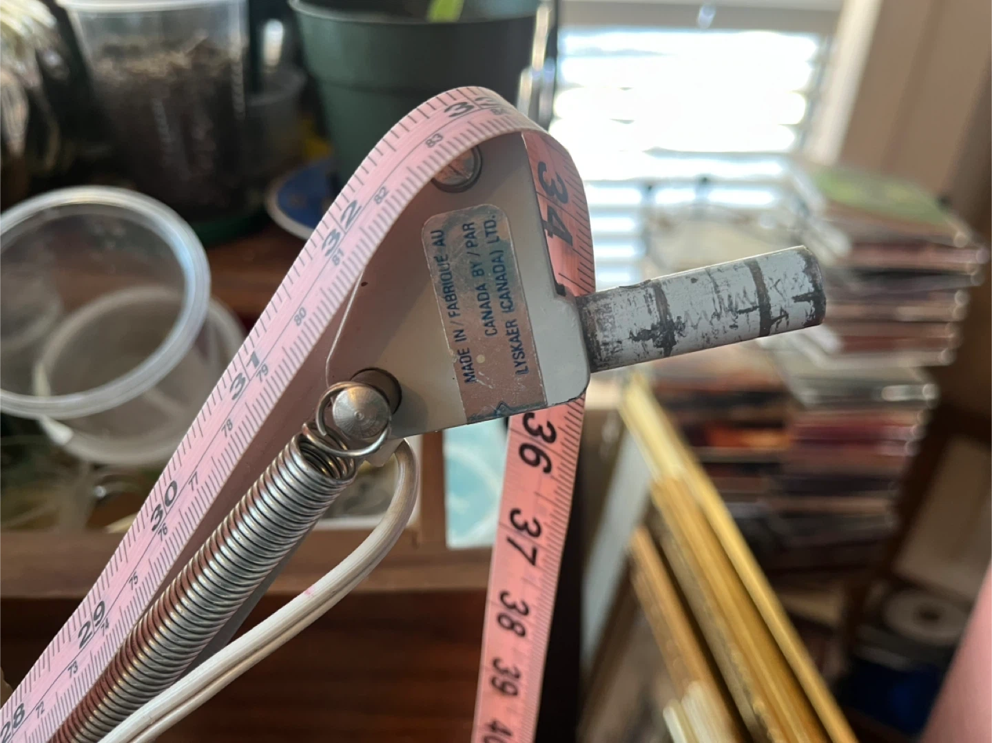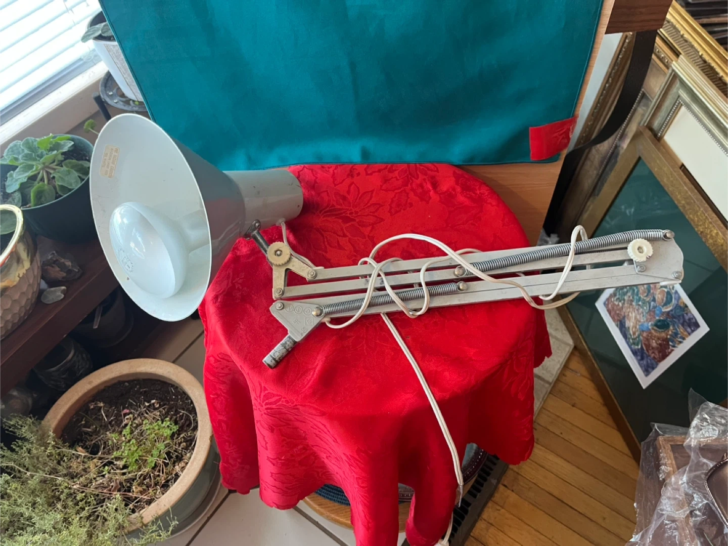Articulating desk lamp from an amazing artist’s studio. Some paint on it shows its use.