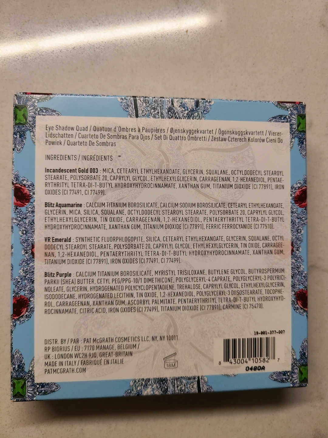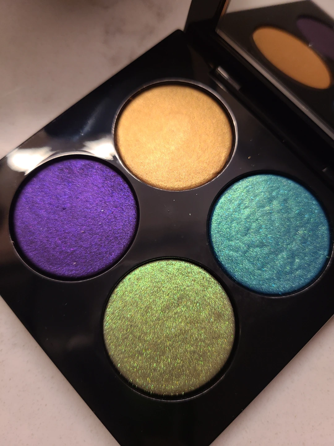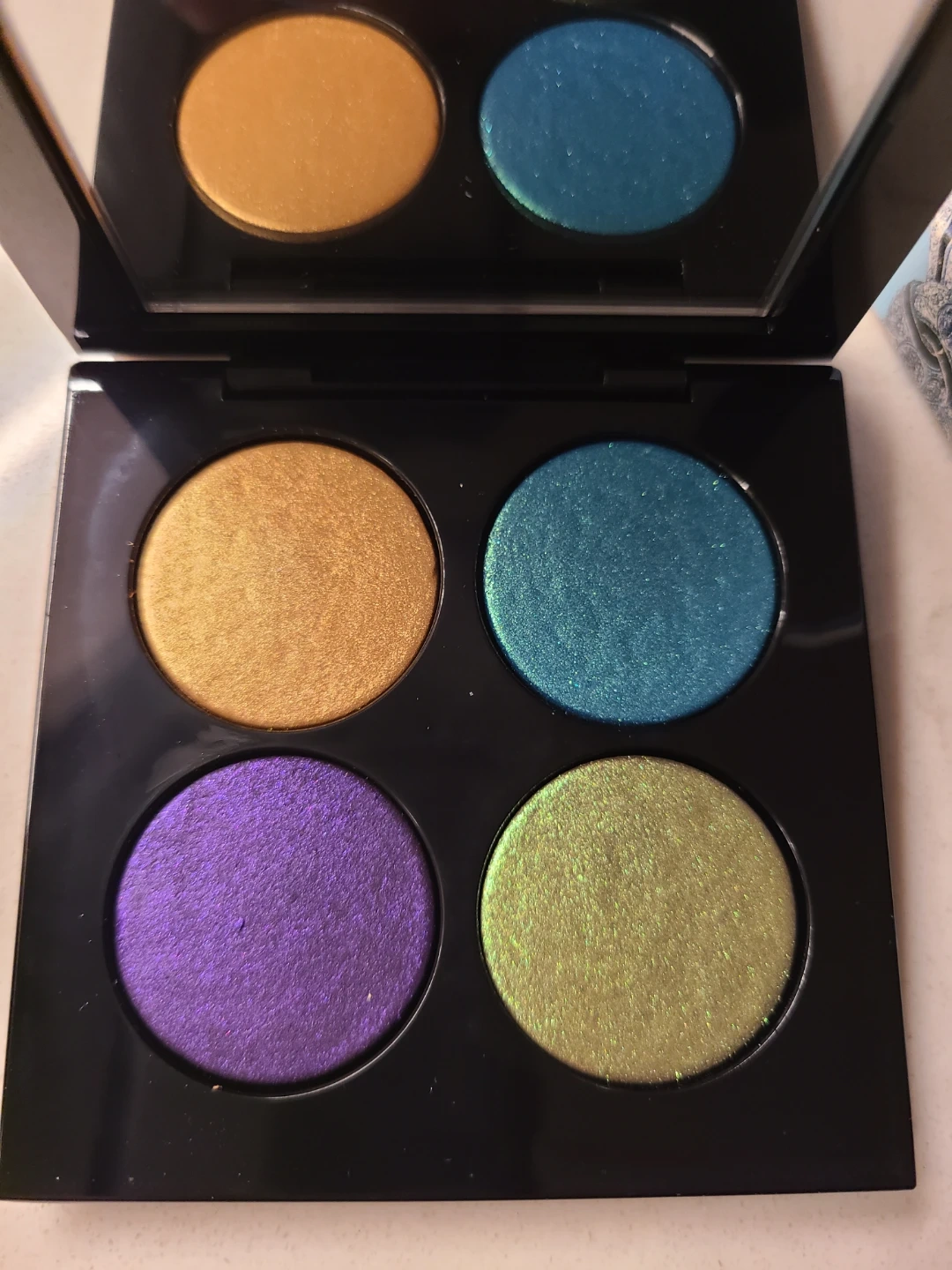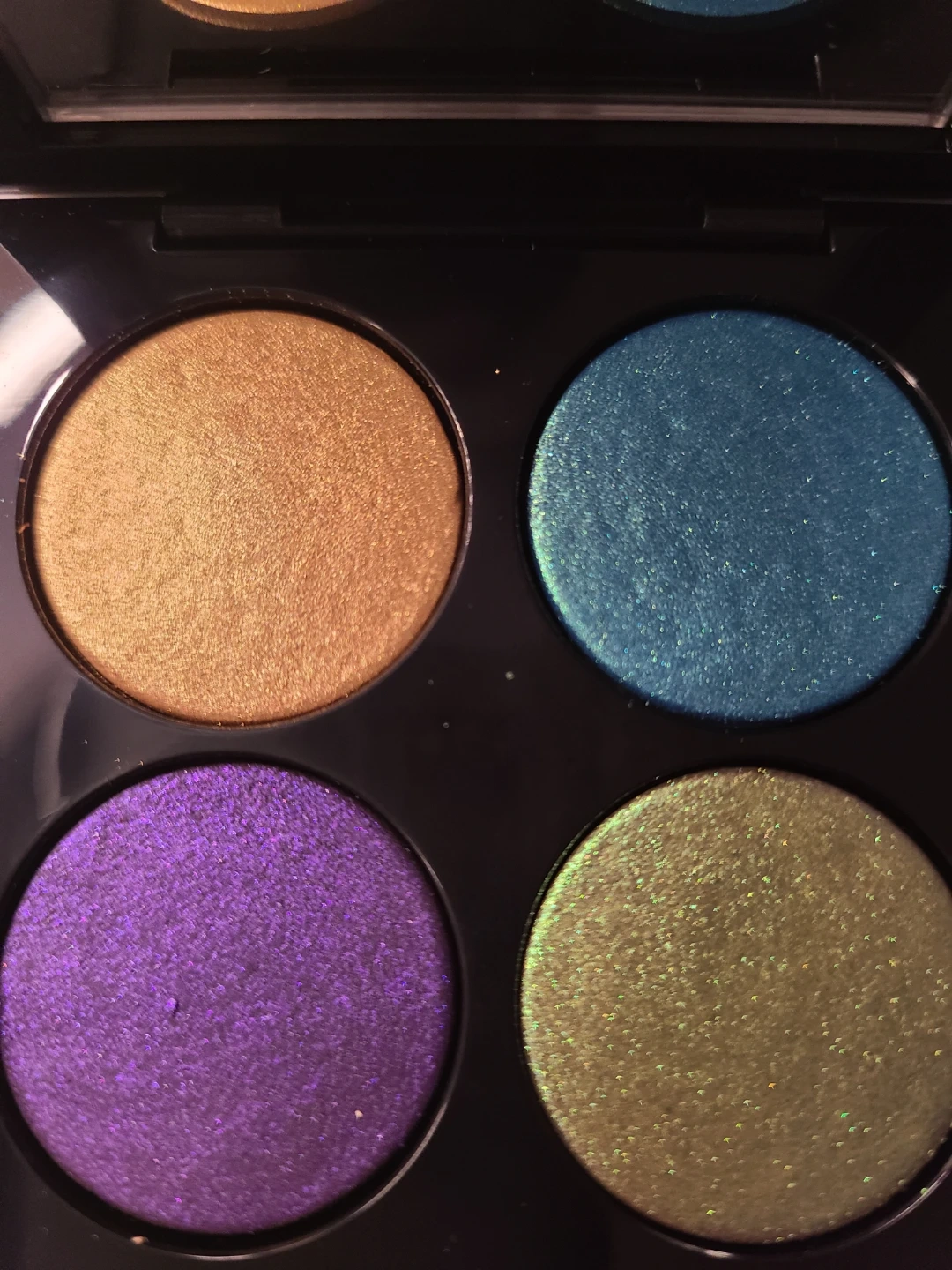 Pat McGrath Labs BLITZ ASTRAL QUAD NOCTURNAL NIRVANA eyeshadow palette. It has four shimmery shades. The colours are highly pigmented and blendable.