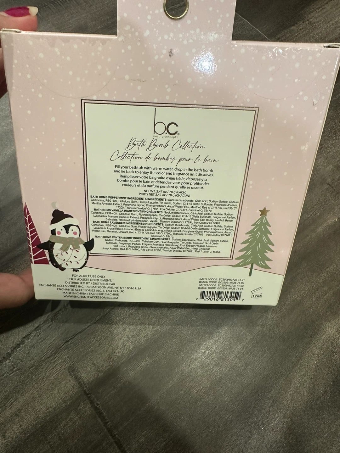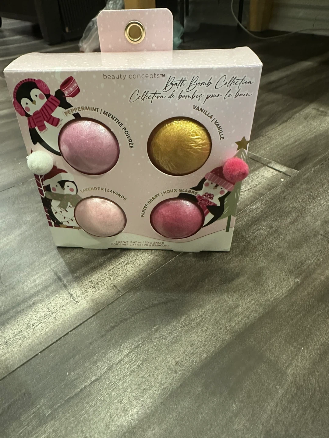 A bath bomb collection featuring four scents: Peppermint, Vanilla, Lavender, and Winter Berry. Each bomb is 70g. These are great for a relaxing soak!