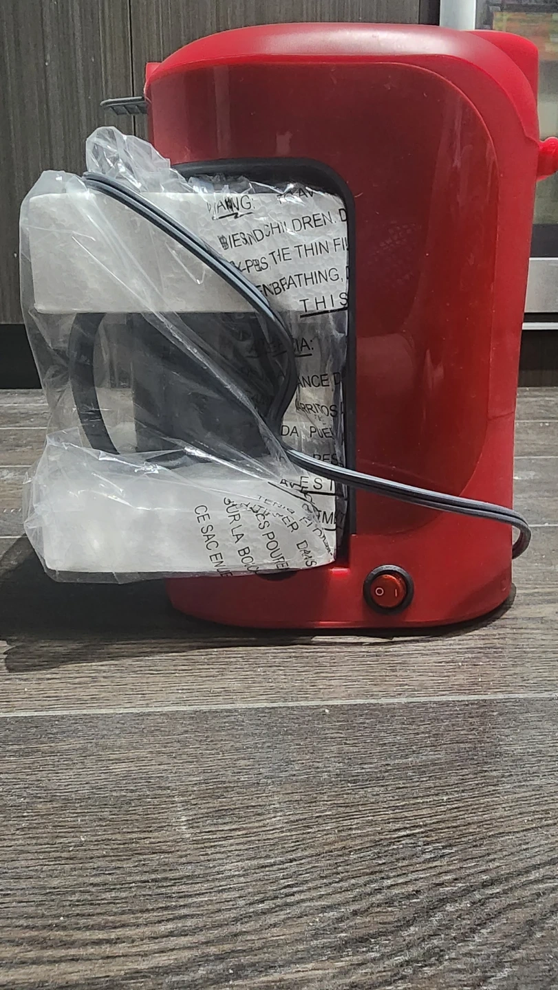 This red Bella coffee maker brews a single cup of coffee. It includes a permanent filter. Compact size takes up less counter space.