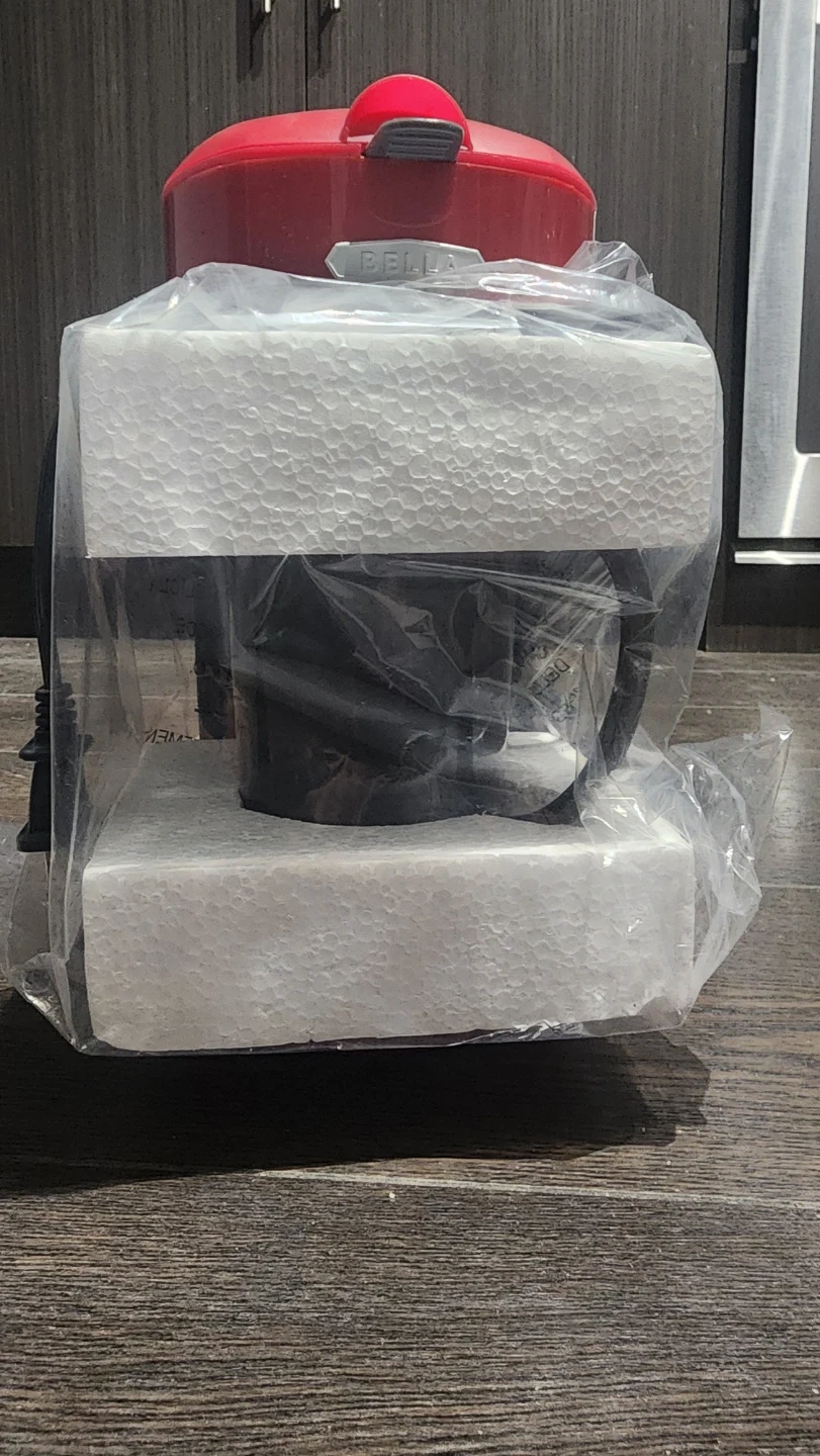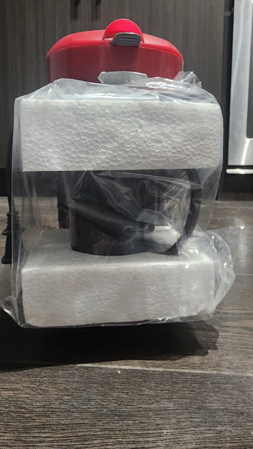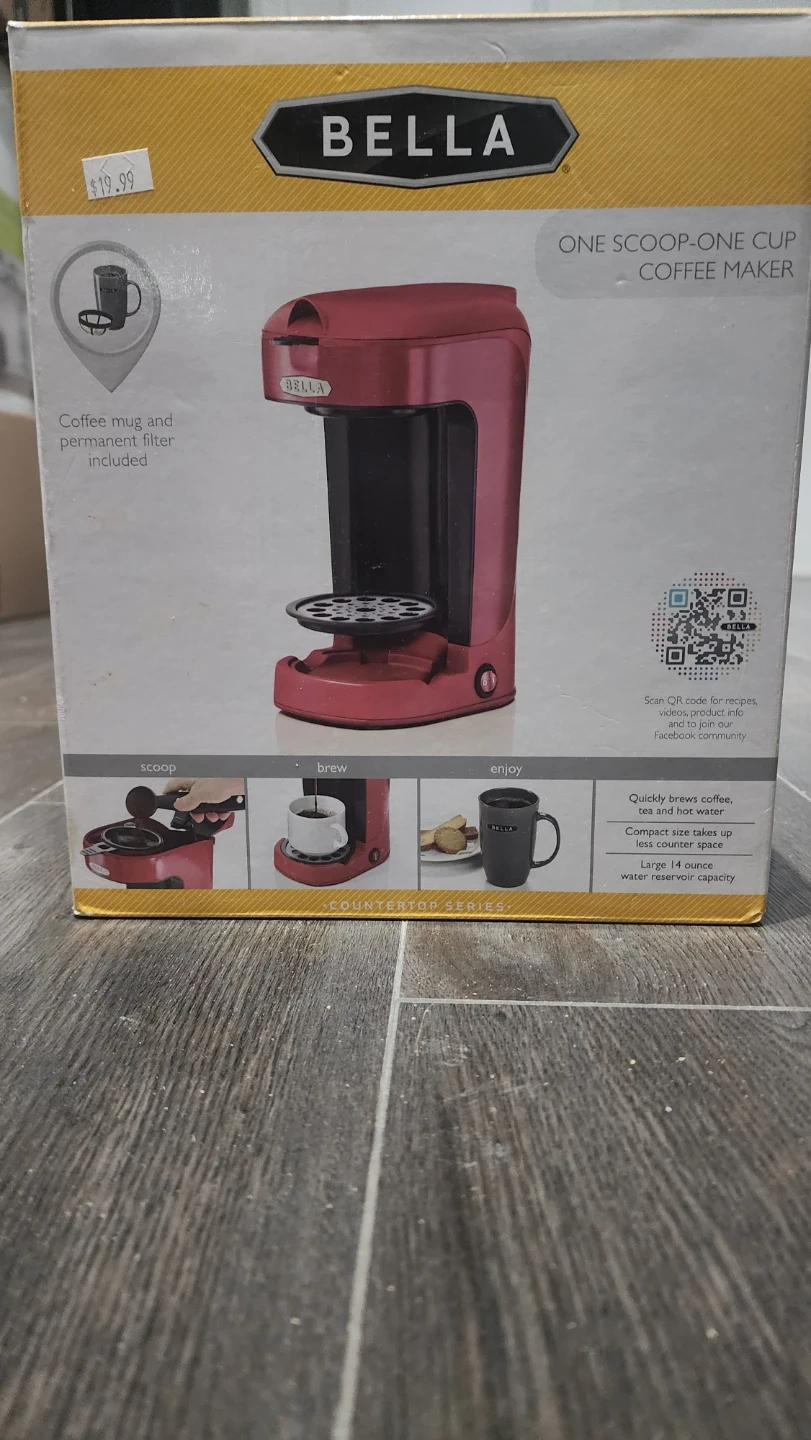 This red Bella coffee maker brews a single cup of coffee. It includes a permanent filter. Compact size takes up less counter space.
