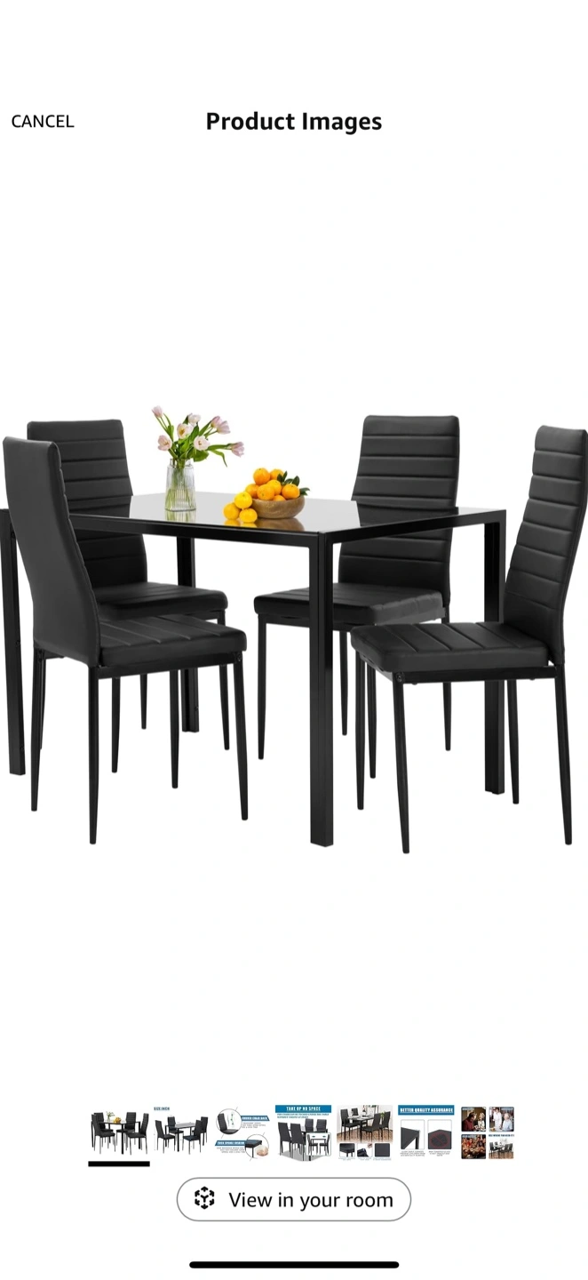 Looking to sell this sleek 5-piece dining table set! It features a black glass top table and four matching chairs with a modern design. The chairs have a comfortable height of 38 inches, while the table measures 47.2 inches in length and 27.5 inches in width. Perfect for a smaller dining space or kitchen!