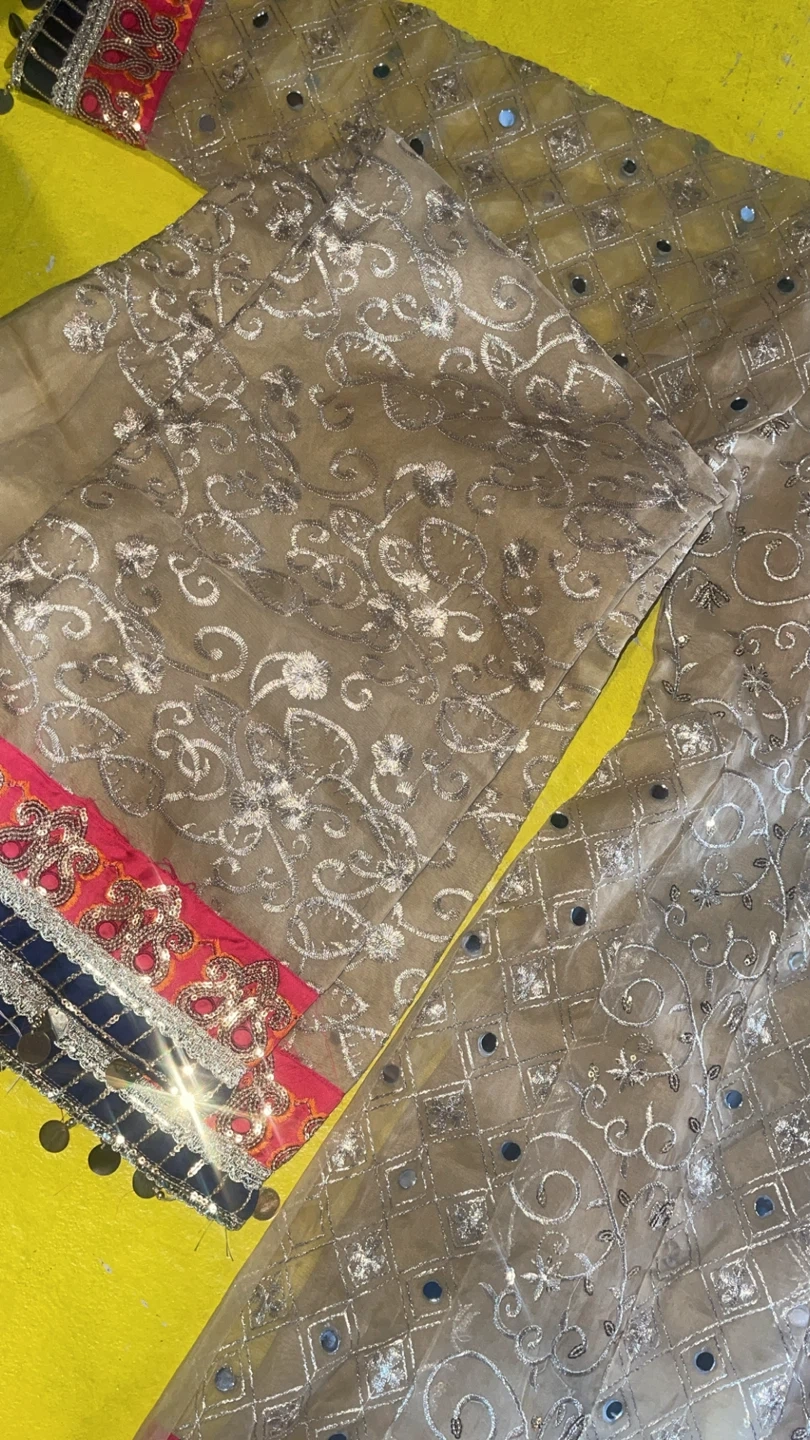 This is a beautiful embellished kurti with a matching dupatta for kids. The kurti features intricate embroidery, mirror work, and bead detailing. The dupatta is a vibrant pink with striped accents and a decorative border. Perfect for special occasions!