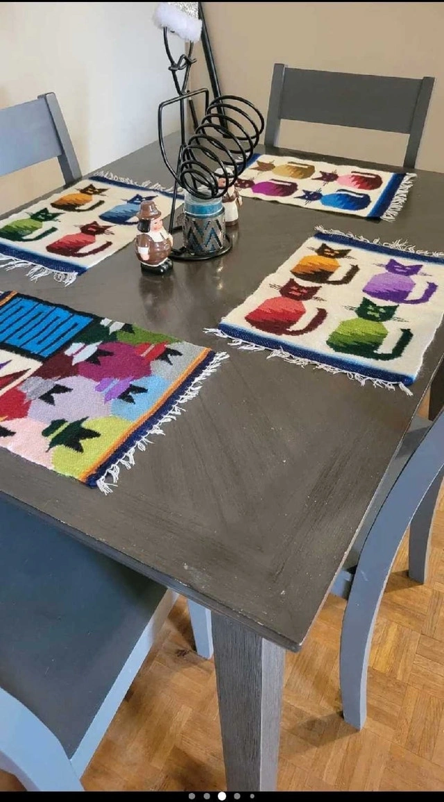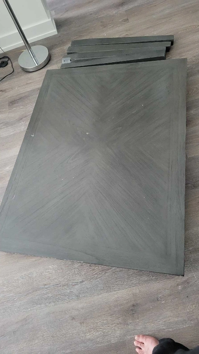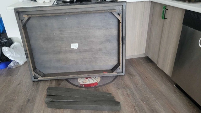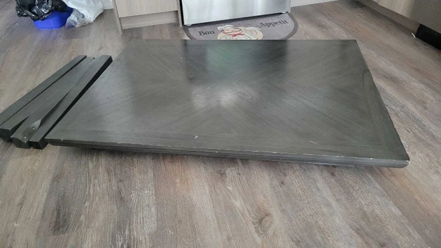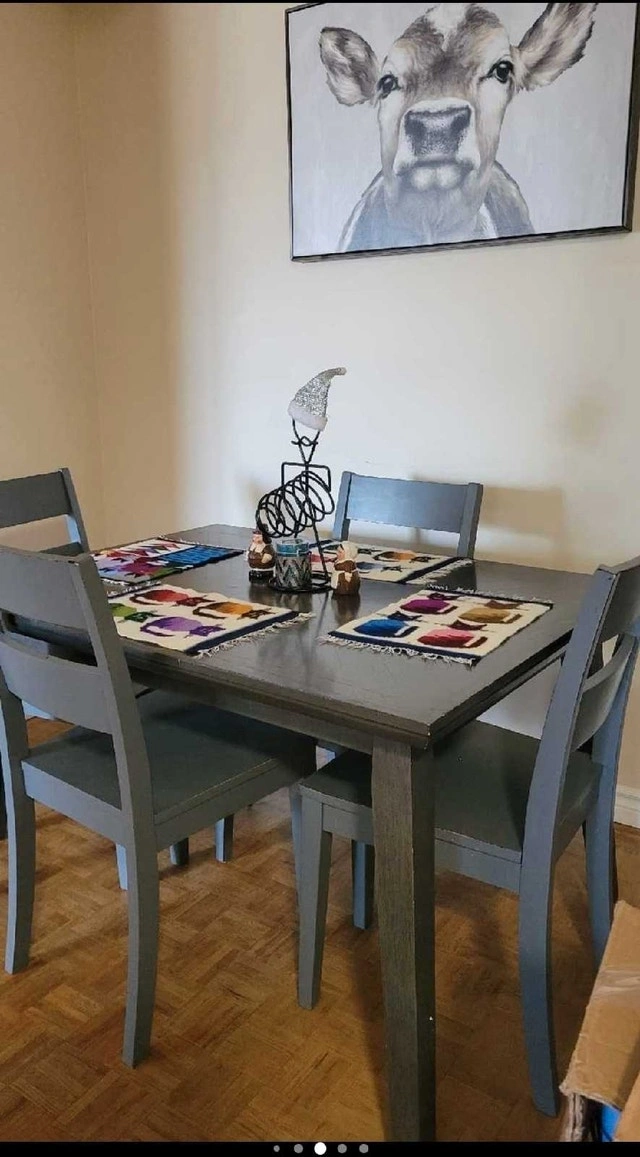 This is a used dining table without chairs, perfect for a small space! The table has a stylish grey finish and is in good condition, ready to be the centrepiece of your dining area. Colour: Grey, Shape: Square, Material: Wood. If the ad is up, it's available for pickup. Cash accepted.