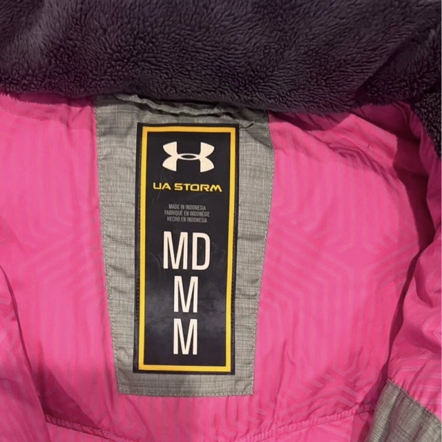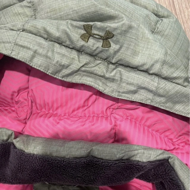 Used Under Armour jacket, perfect for cooler weather. It features a full zip front and a hood. Size Medium. Green exterior with pink interior. Puffer style. If the ad is up, the jacket is available.