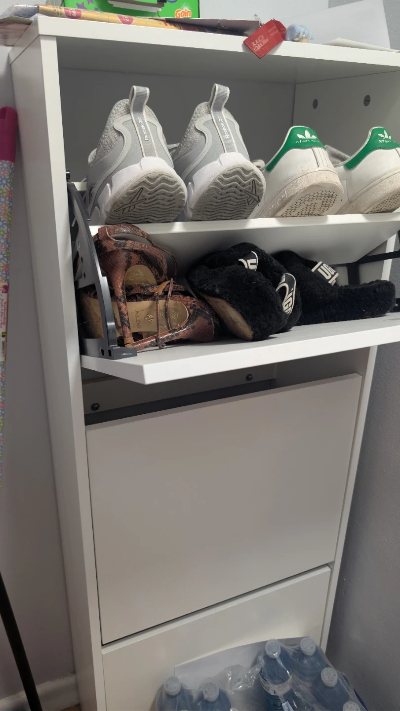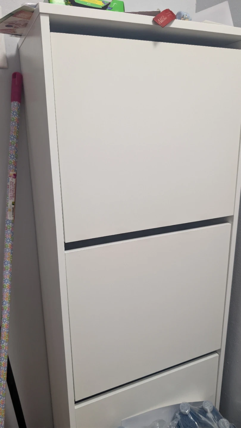 A white shoe cabinet with three tilt-out drawers for storing footwear. It's a tall, narrow unit perfect for hallways or closets. This cabinet can hold several pairs of shoes, keeping them tidy and out of sight. You can drill it against the wall