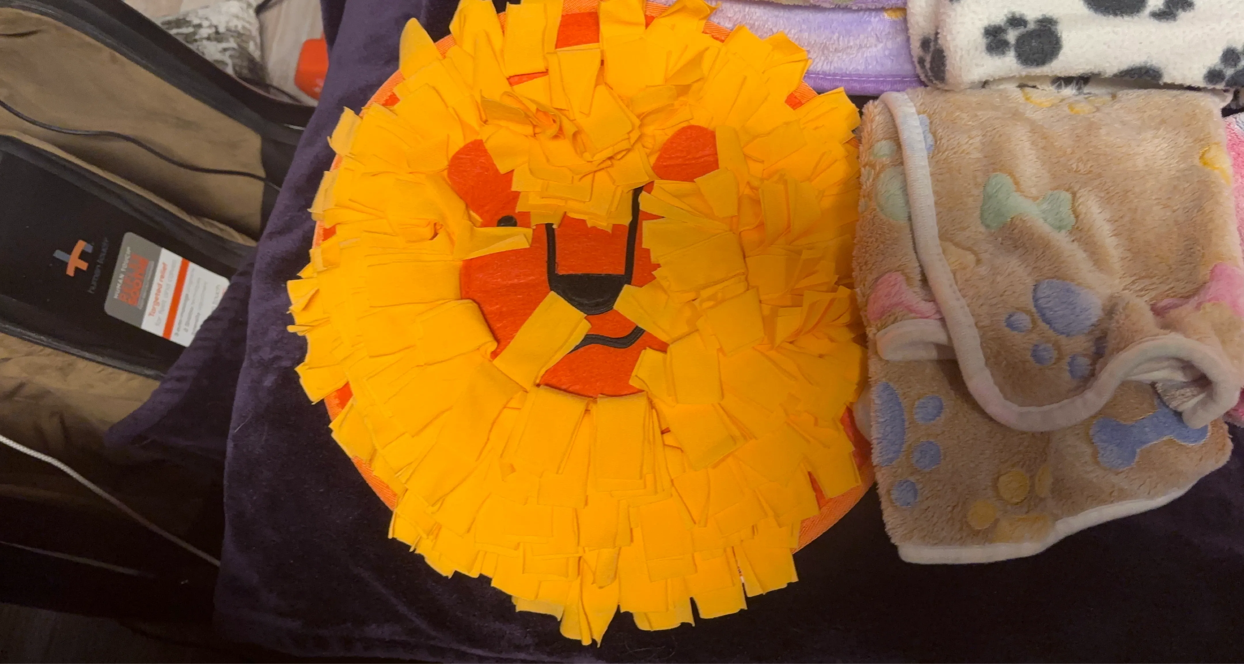 This is a fun snuffle mat designed like a lion's face. It's great for engaging your dog's mind and encouraging natural foraging behaviours. Made with durable fabric materials, it's perfect for hiding treats and kibble.