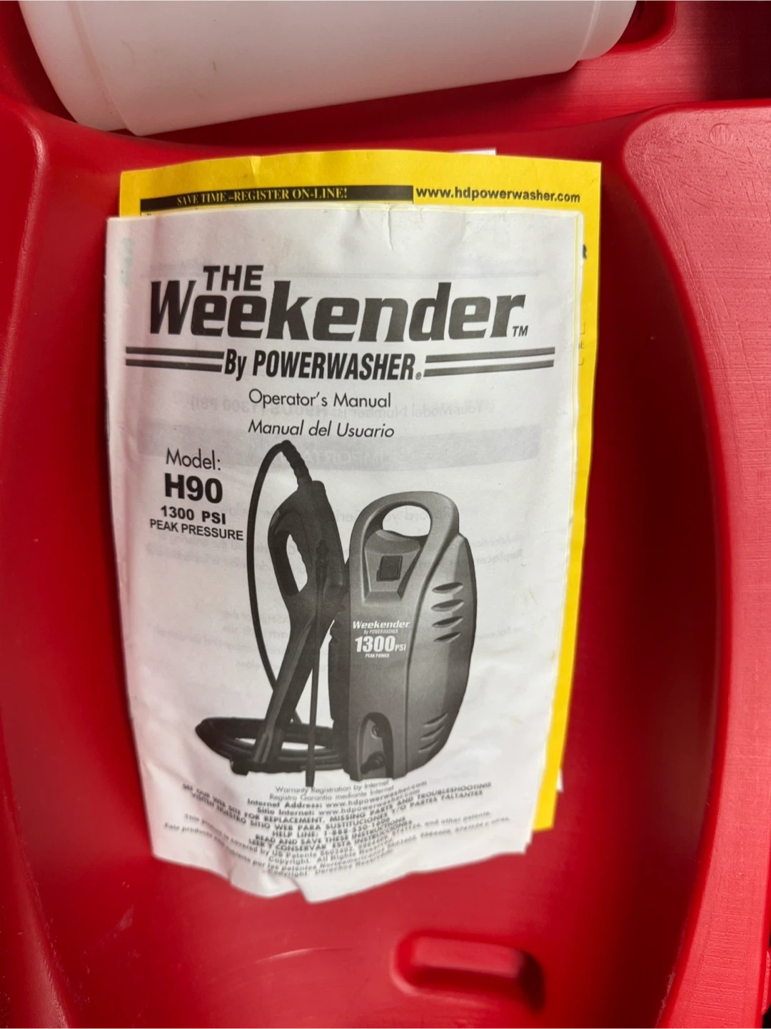 This is a Weekender H90 pressure washer. It has 1300 PSI peak pressure. Comes with a bottle and manual in its case. In good working condition