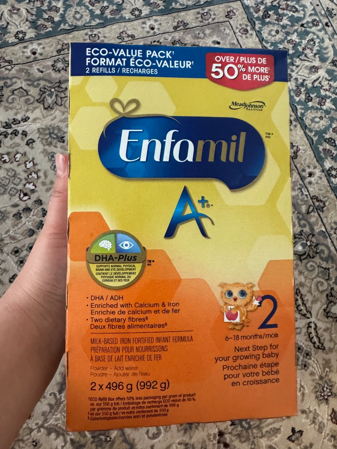 Selling an Enfamil A+ infant formula eco-value pack. This is the next step for your growing baby, suitable for ages 6-18 months. It's a milk-based, iron-fortified formula. The pack contains 2 refills, each 496g (992g total).