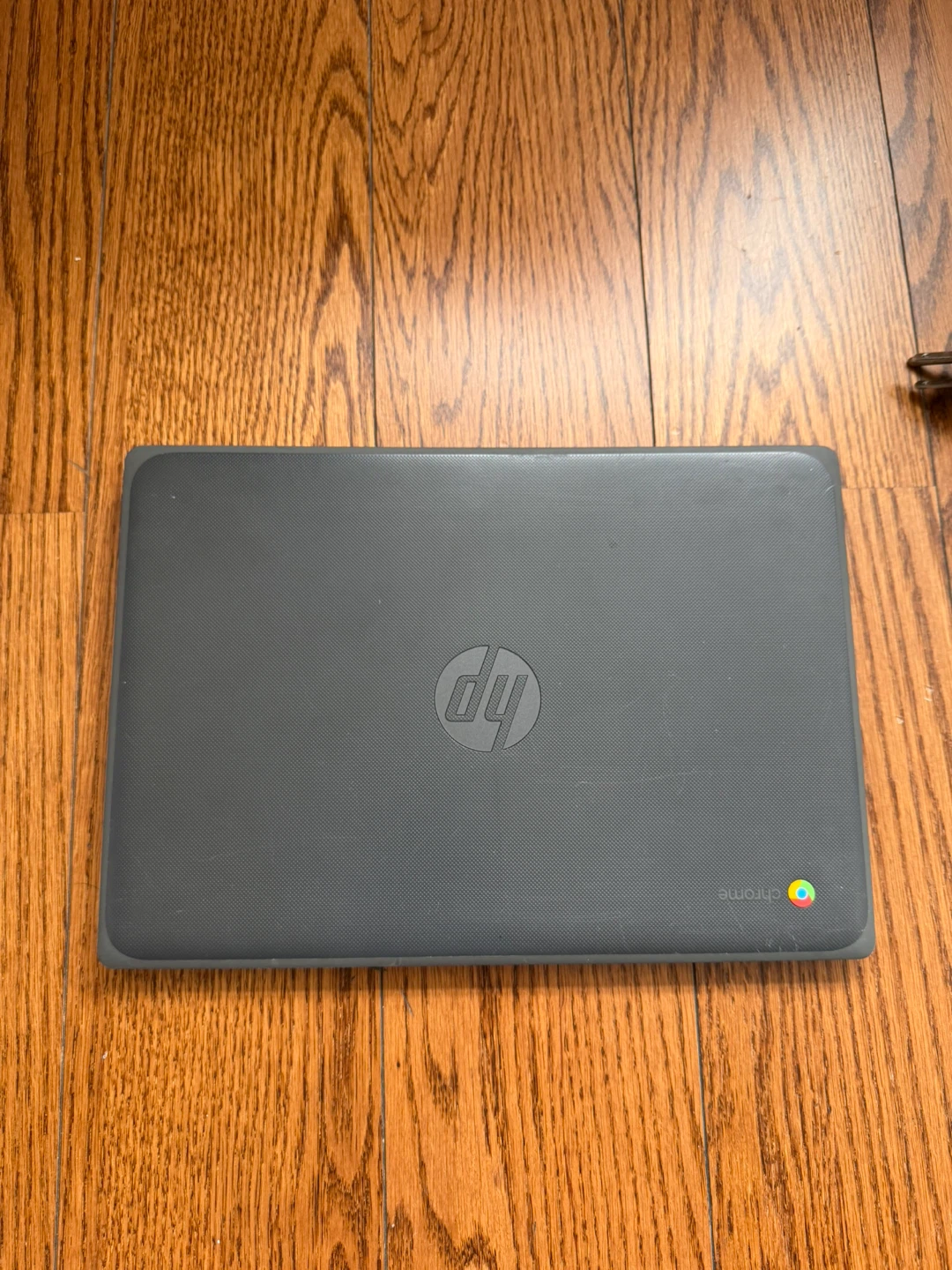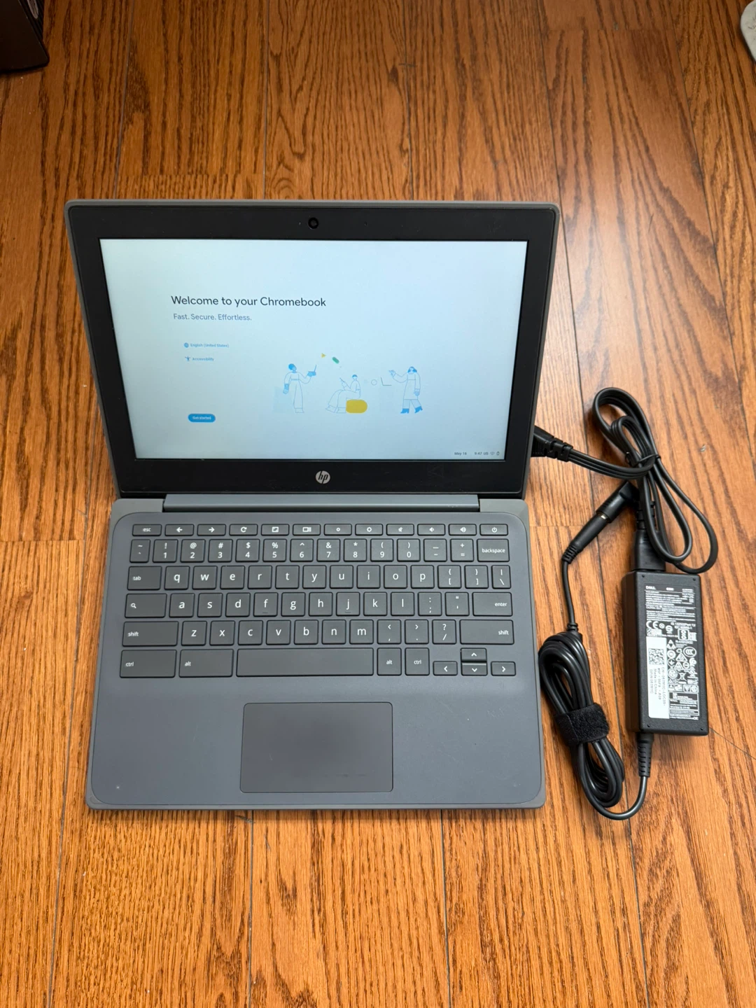 This is an HP Chromebook laptop. It comes with its original power adapter. It's a portable device for everyday tasks. This would be useful for students or for quick web browsing.