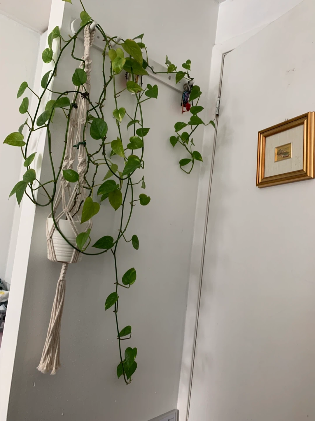 A vibrant Pothos plant. This plant adds a touch of green to any room. Its trailing vines bring life to your space! *ceramic pot and hanger not included*