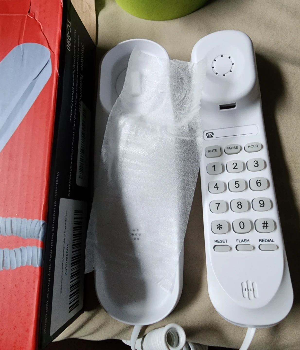 This is a corded landline telephone. It features mute, pause, and hold buttons. Includes original packaging.