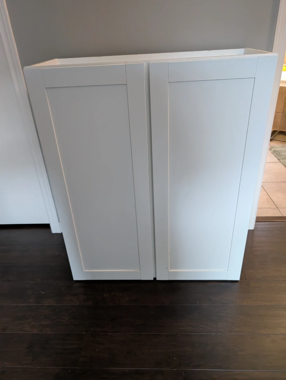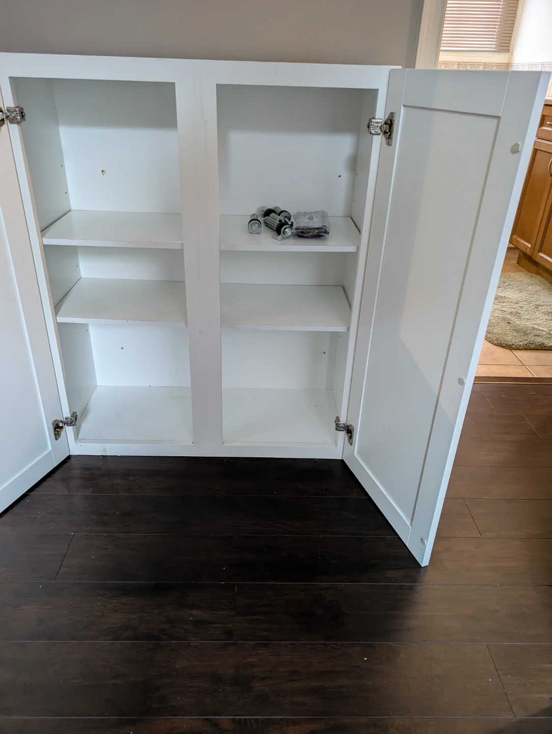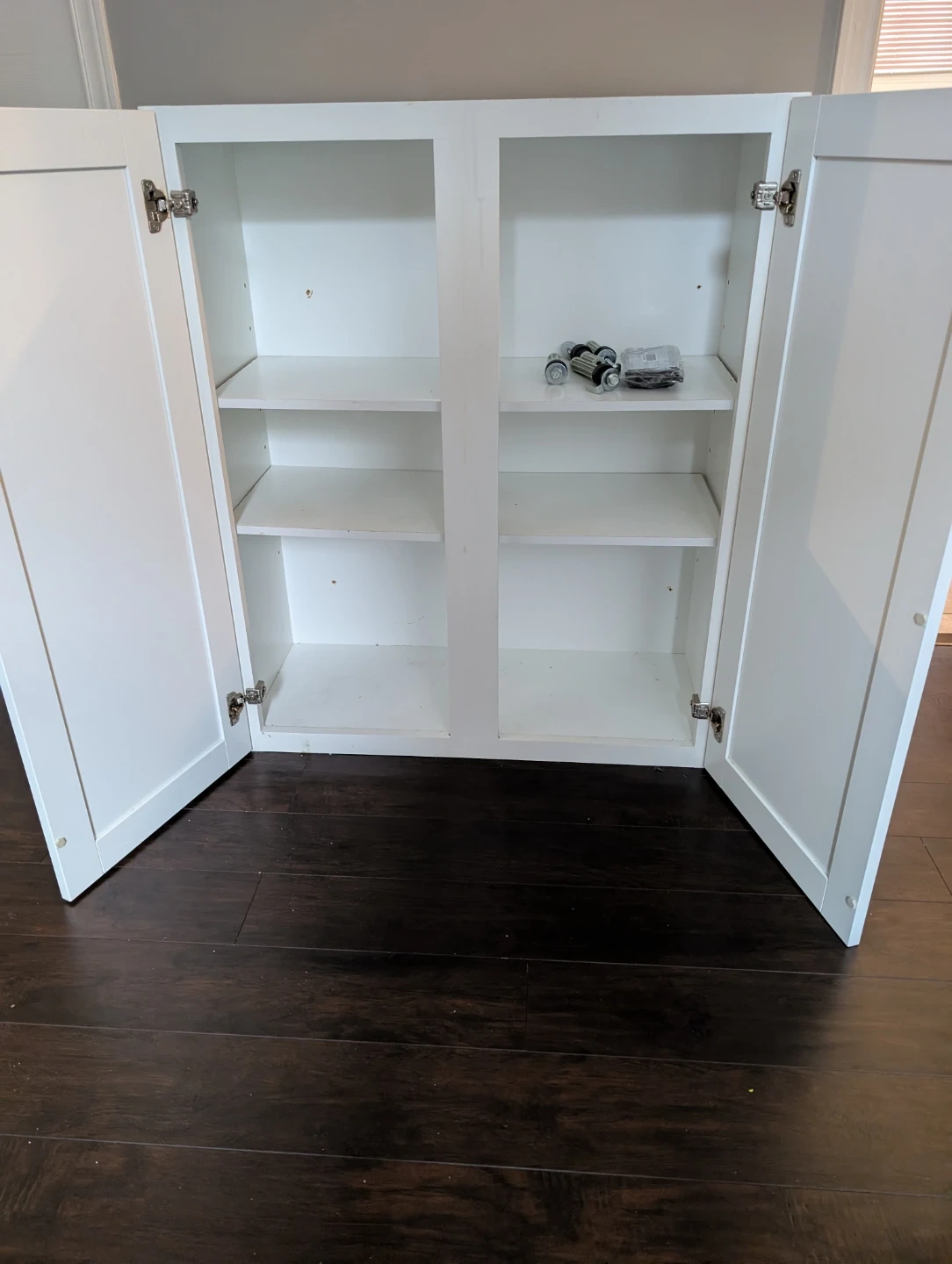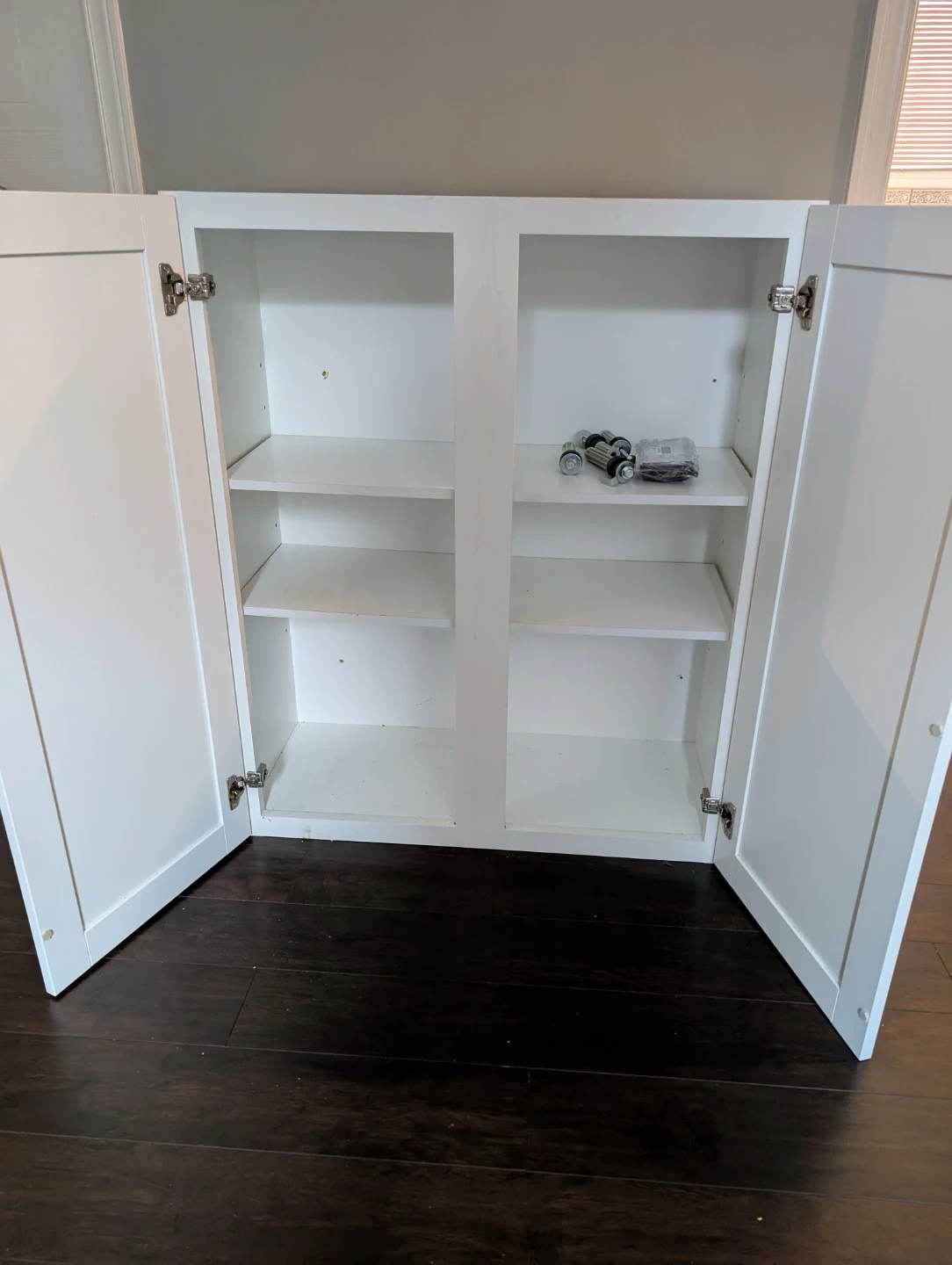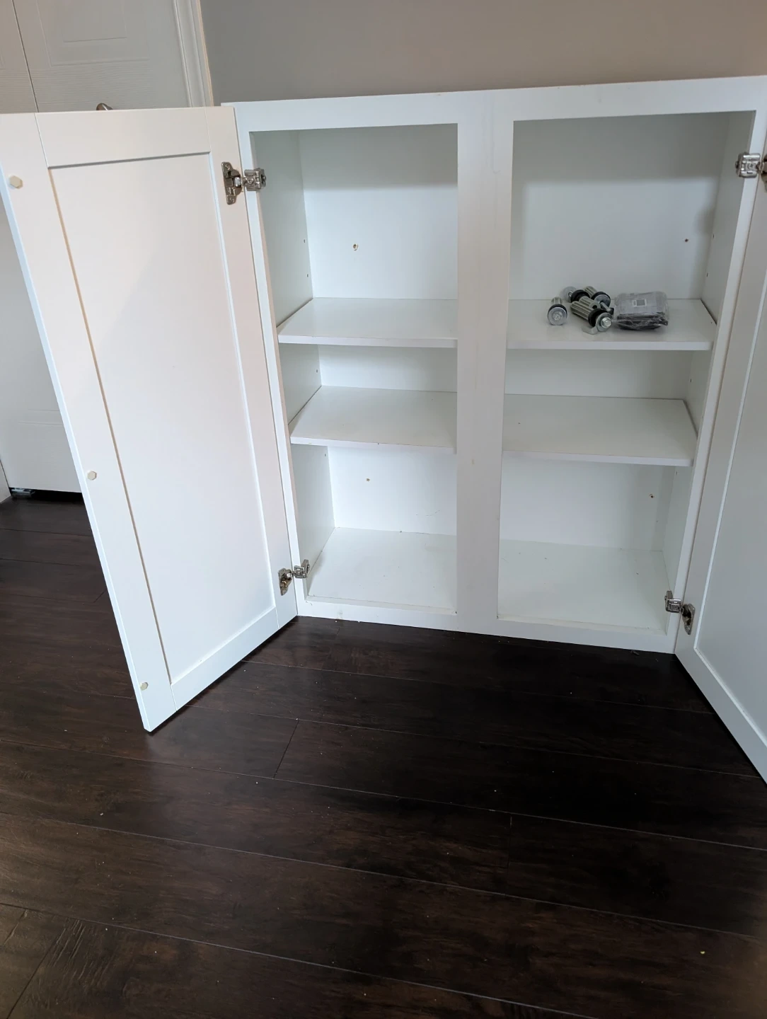 This white cabinet has two doors and adjustable shelves inside. It's great for storing linens or kitchen essentials. The doors have standard hinges.