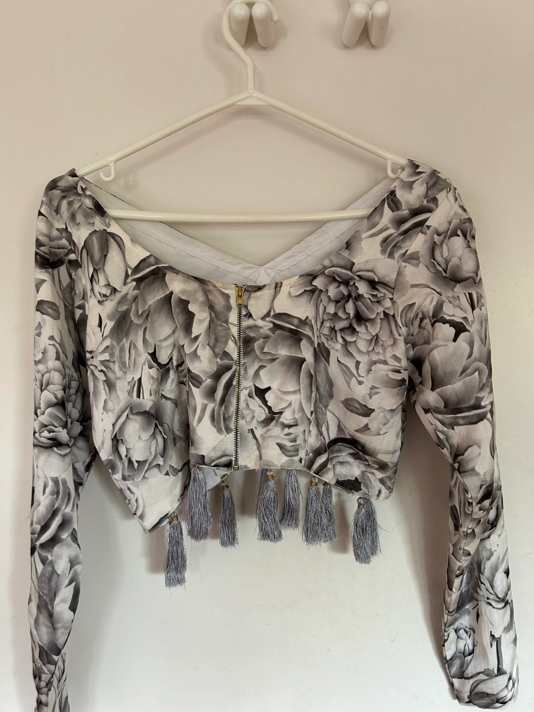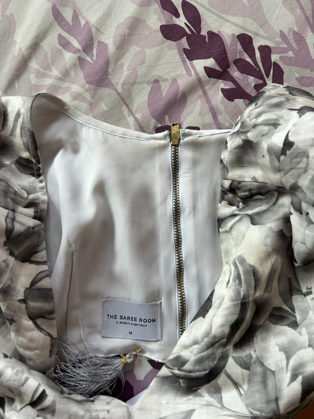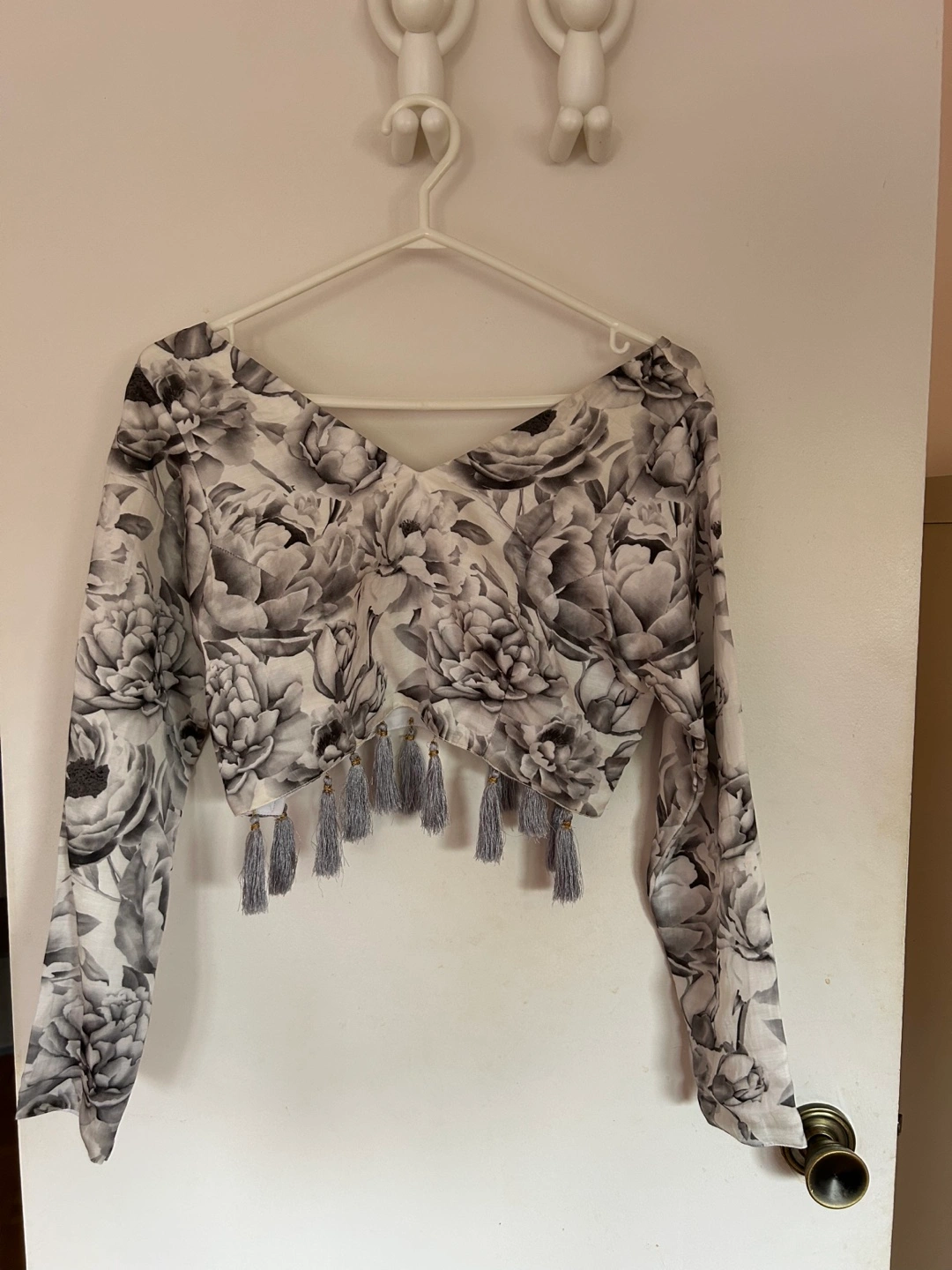 Selling a beautiful floral blouse from The Saree Room. It's a size medium and features a unique design with tassels. Perfect for adding a touch of elegance to any outfit. Fully unzips at the back.