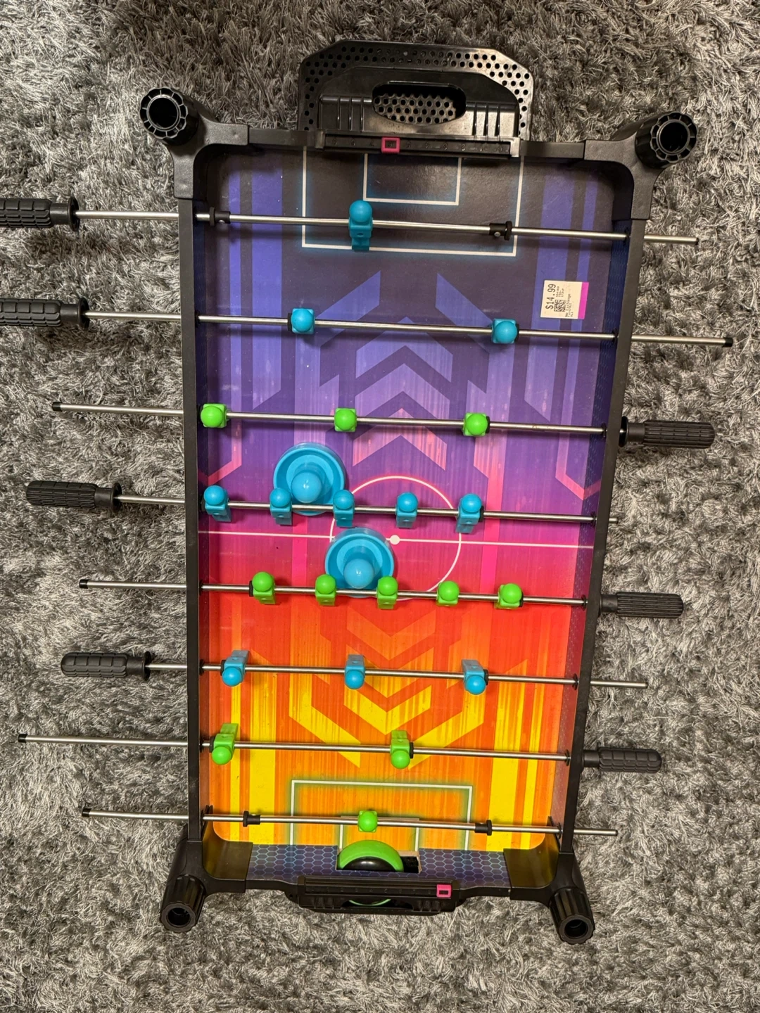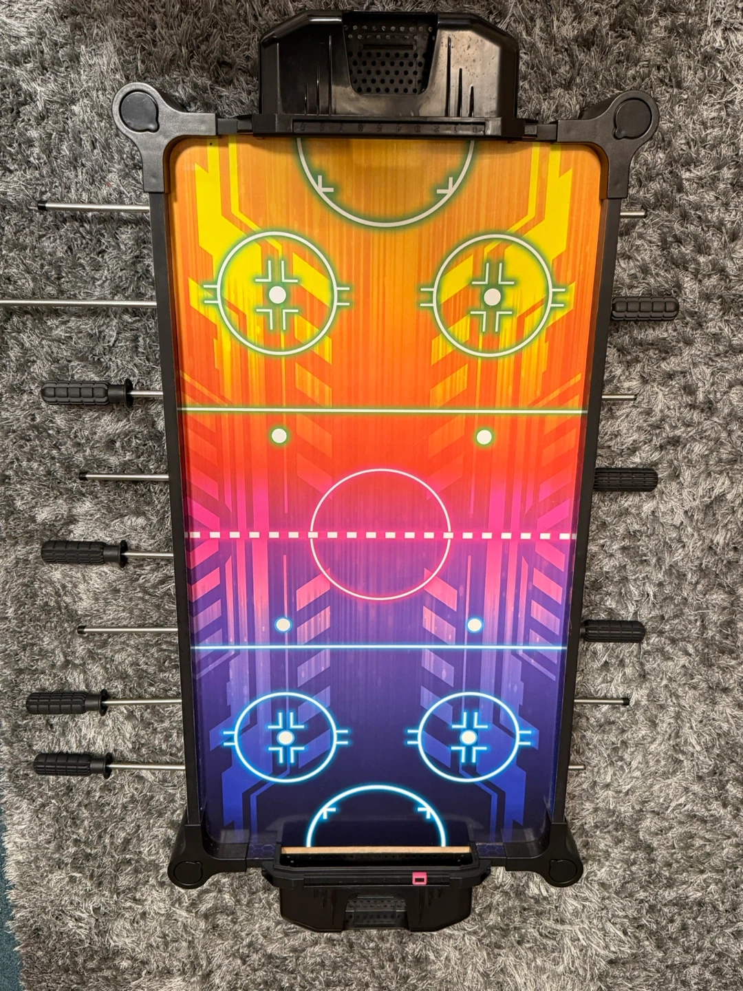 This compact foosball table features a vibrant hockey arena design. It's great for some quick tabletop fun! Includes all players and pucks.