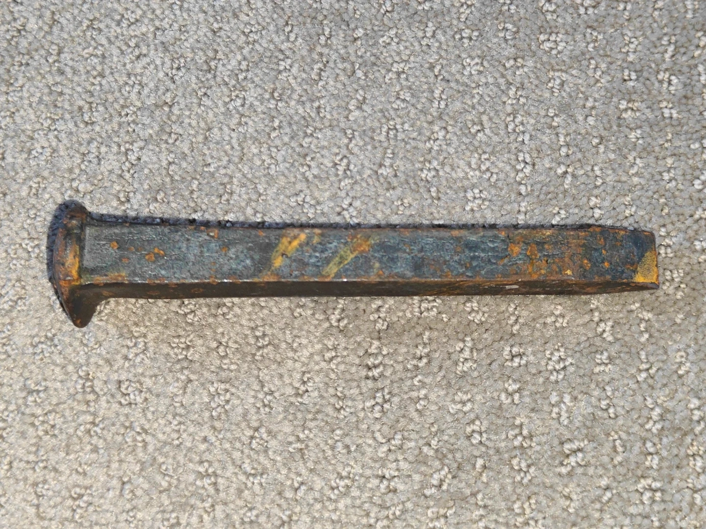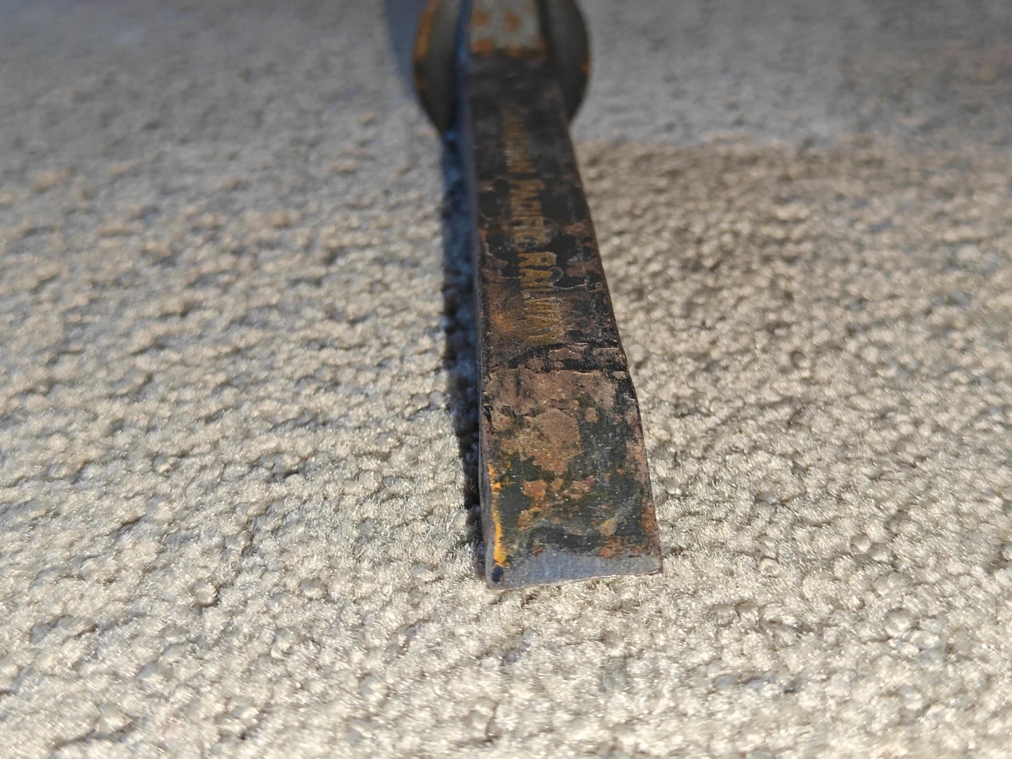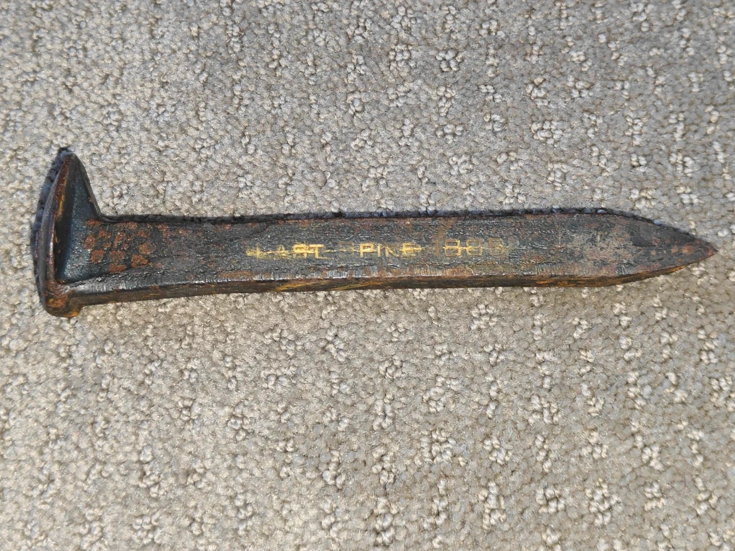This genuine steel railway spike (6.5 inches long) is beautifully engraved with: