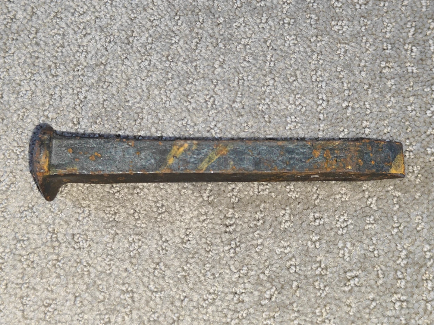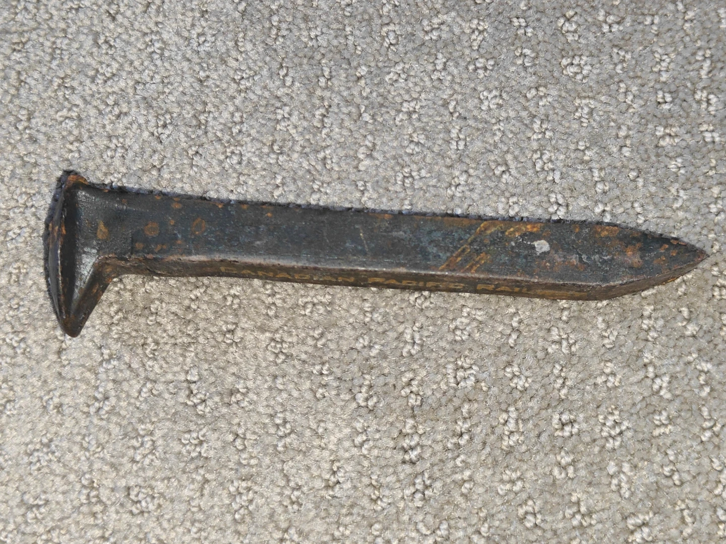 This genuine steel railway spike (6.5 inches long) is beautifully engraved with:
