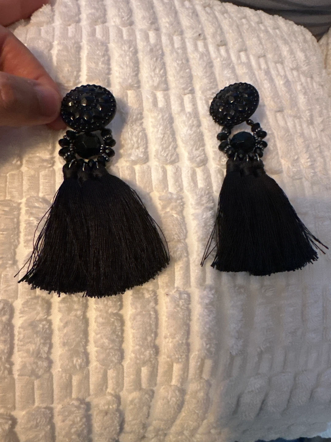 These black tassel earrings are adorned with sparkling rhinestones. They hang from a round, gem-encrusted stud. These statement earrings are sure to add a touch of glamour to any outfit!