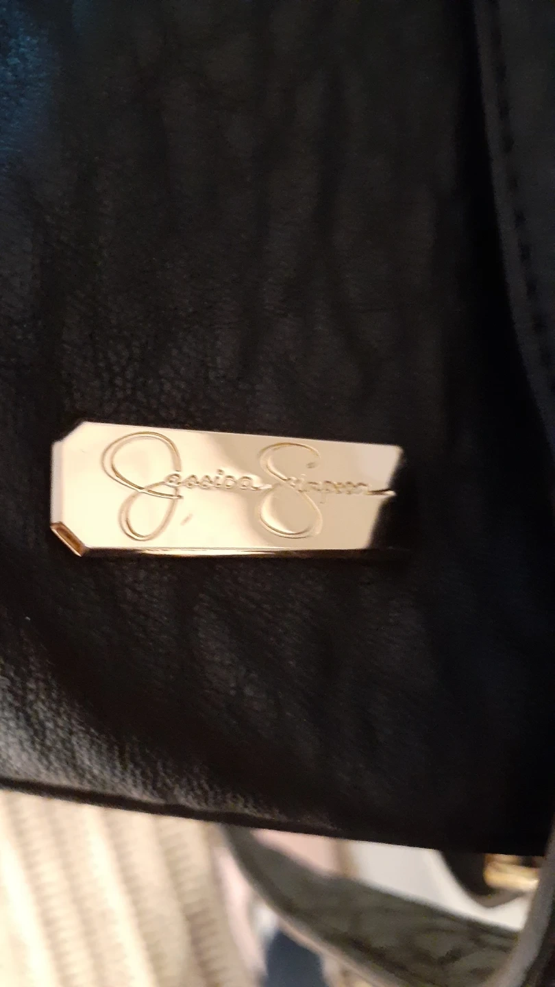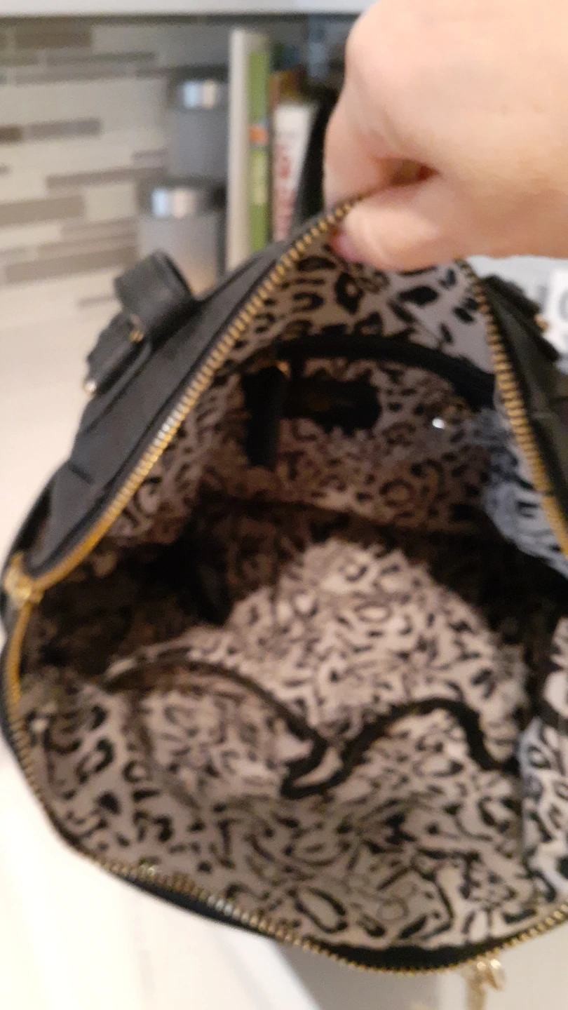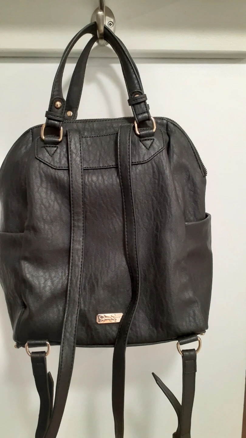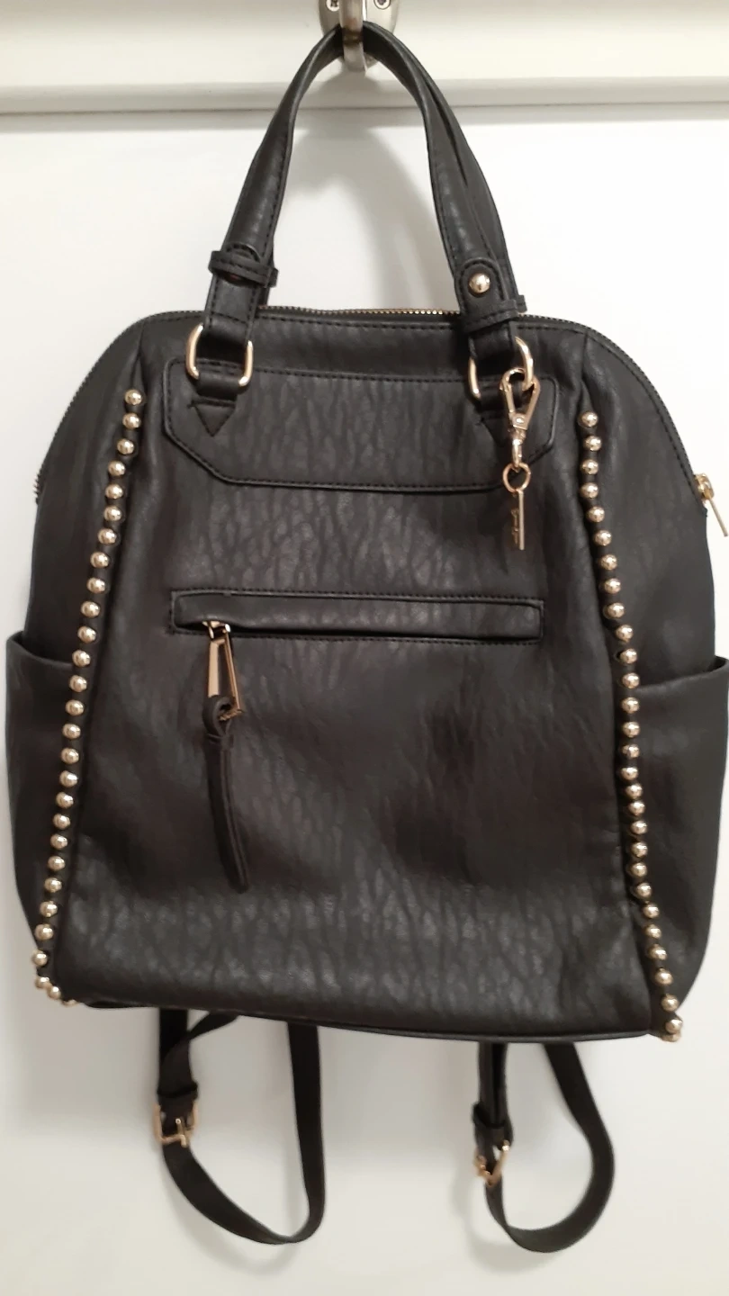 This black Jessica Simpson backpack is made of black faux leather. It features a studded design along the front and sides, with gold-tone hardware. Includes top handles and adjustable shoulder straps for versatile carrying. The interior lining has a leopard print.