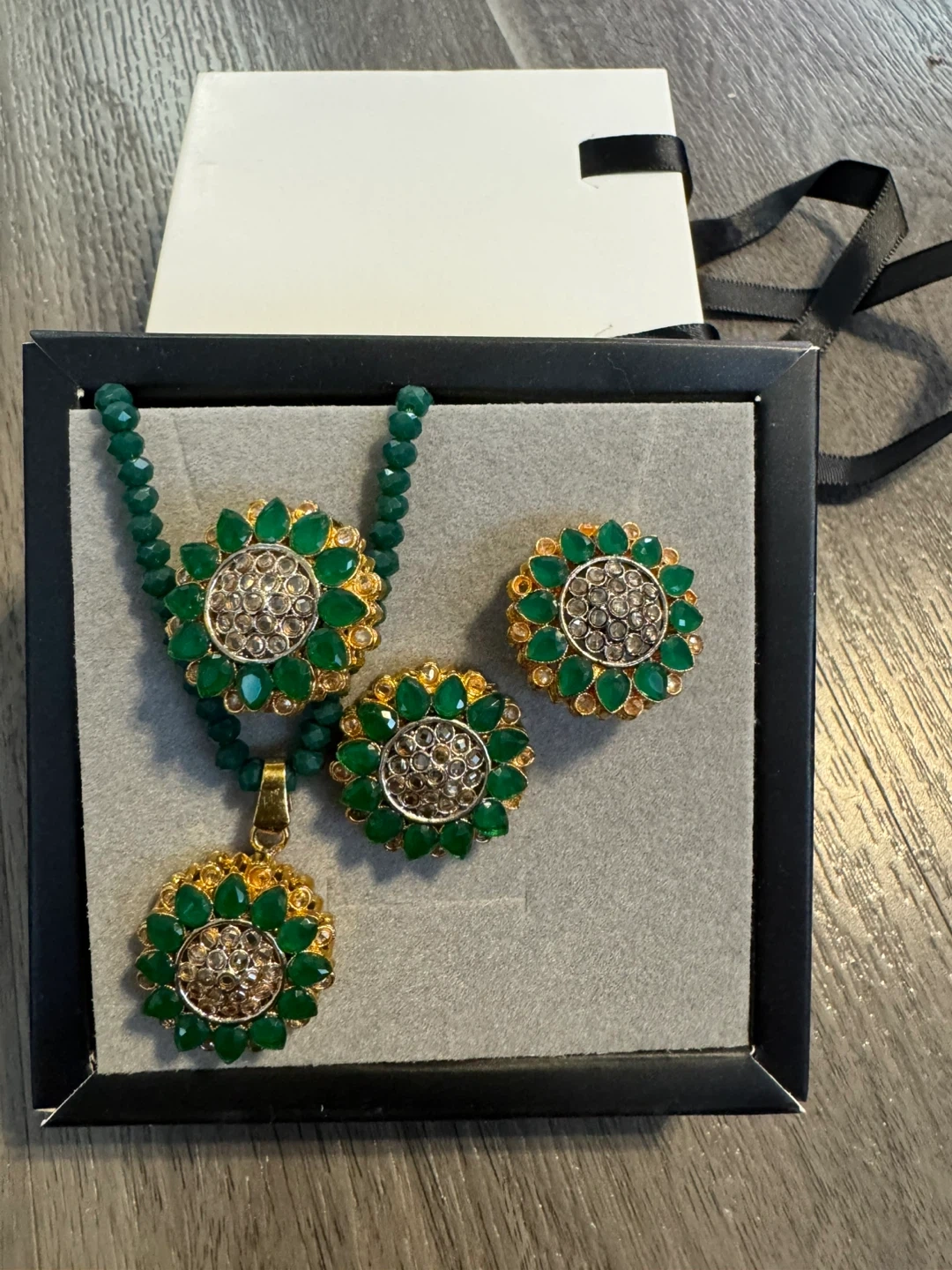 This is a necklace and earrings set with a pendant. It features green beads and gold-tone accents with green and clear stones. Comes in a display box.