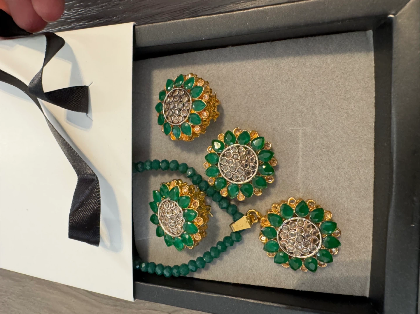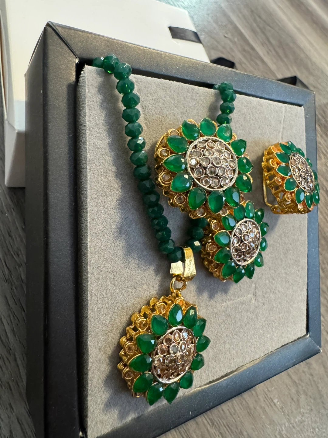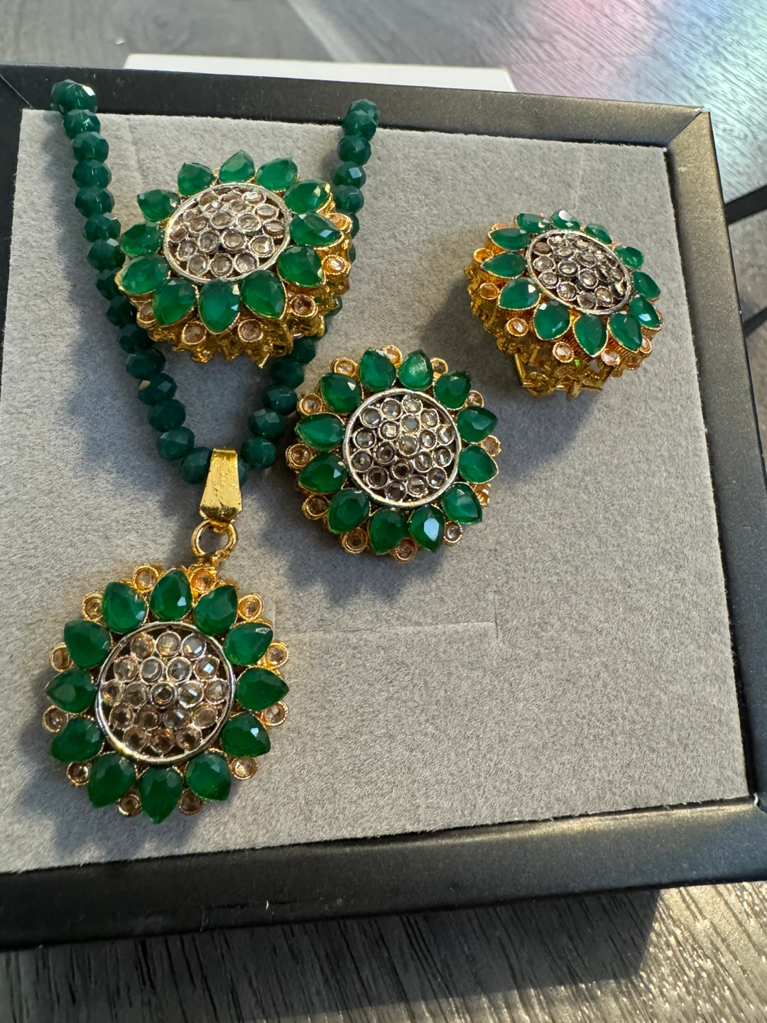 This is a necklace and earrings set with a pendant. It features green beads and gold-tone accents with green and clear stones. Comes in a display box.