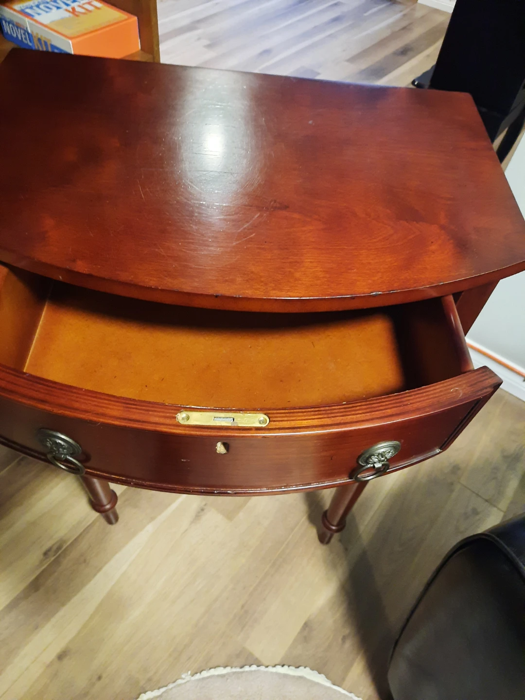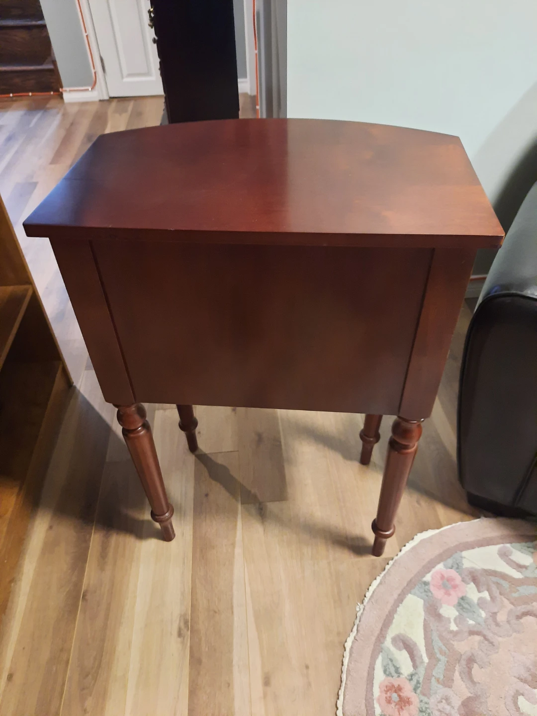 Hello bargain shopper! And interior designer/stager so great to meet you! I have a lovely cherry-wood side table with two drawers. Its curved front adds a touch of elegance. Great for storing small items or as a bedside table. I have used as my favorite book stand to read my favorite books and have a coffee. Wonderful piece of Bombay furniture. Downsizing! Sorry to see this sell. I want it to go to another home to be cherished and enjoyed like I have.