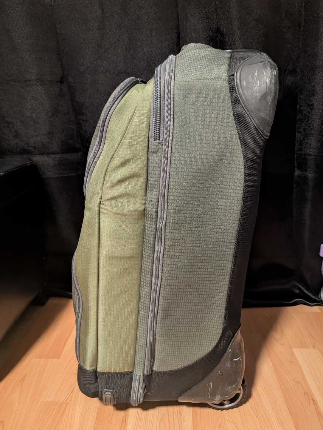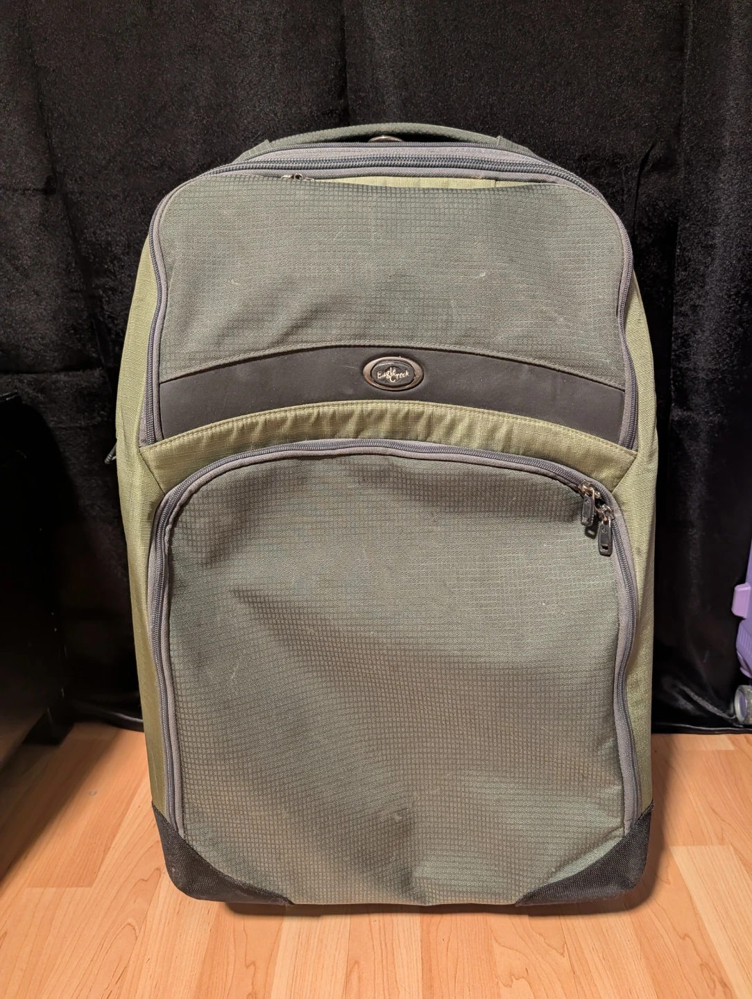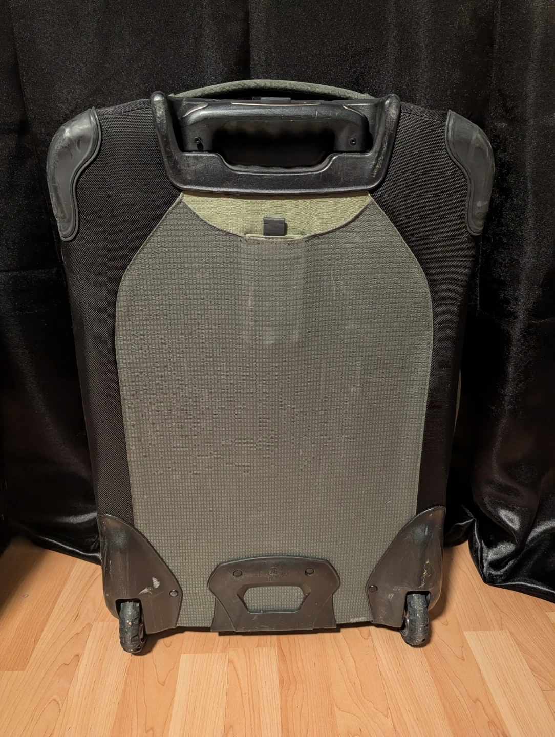 This is a rolling suitcase from Olympus. It's a green and black colour. It has wheels for easy transport.