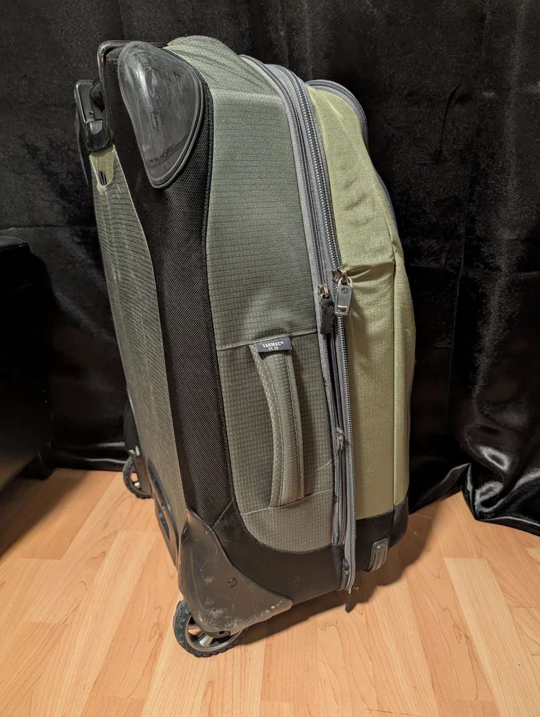 This is a rolling suitcase from Olympus. It's a green and black colour. It has wheels for easy transport.