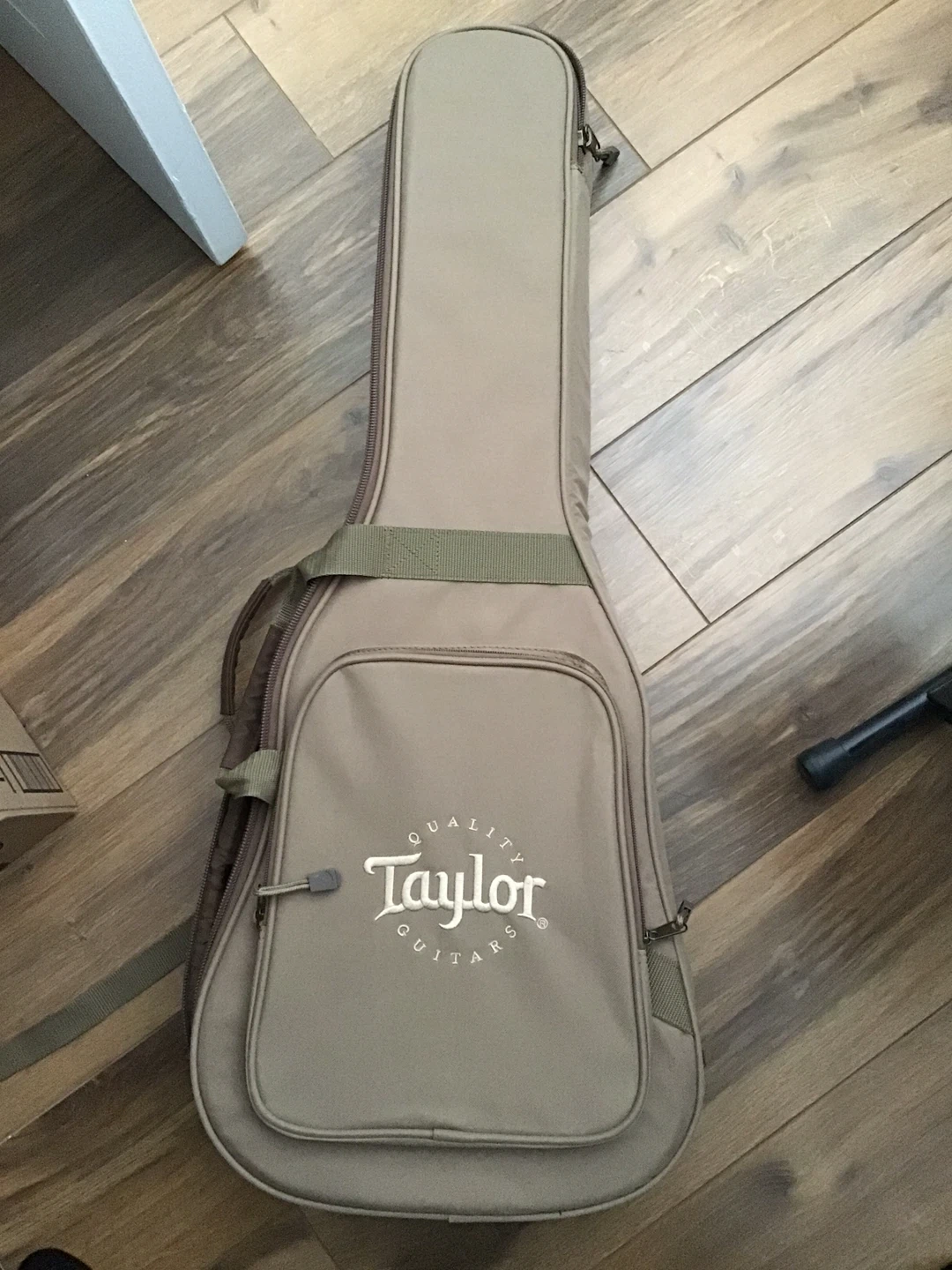 This is a Taylor Baby acoustic guitar. It's a smaller body size, making it comfortable to play. Includes a padded Taylor gig bag for protection and transport.