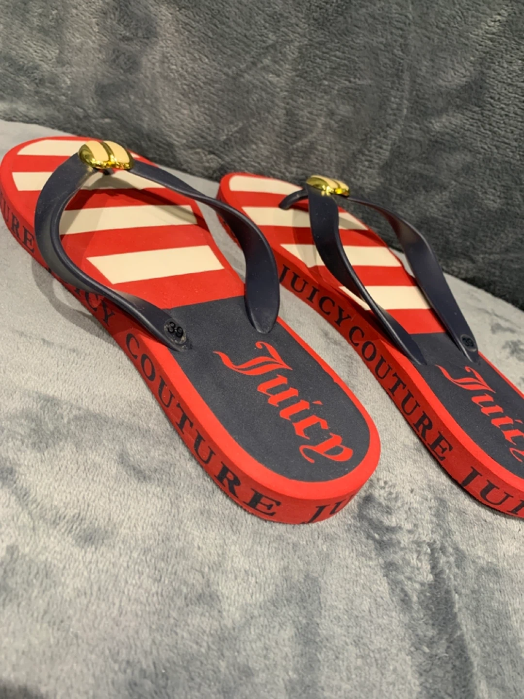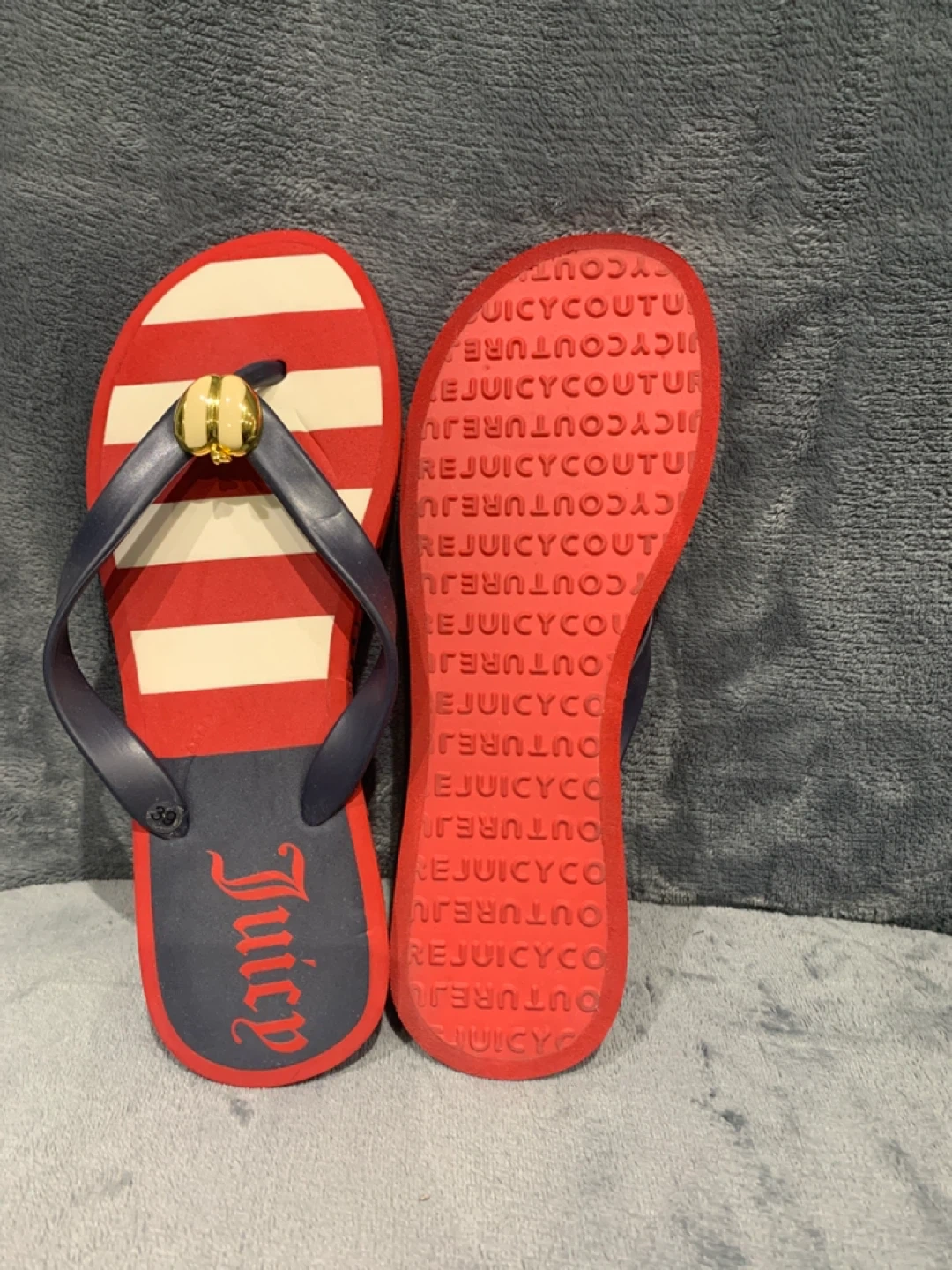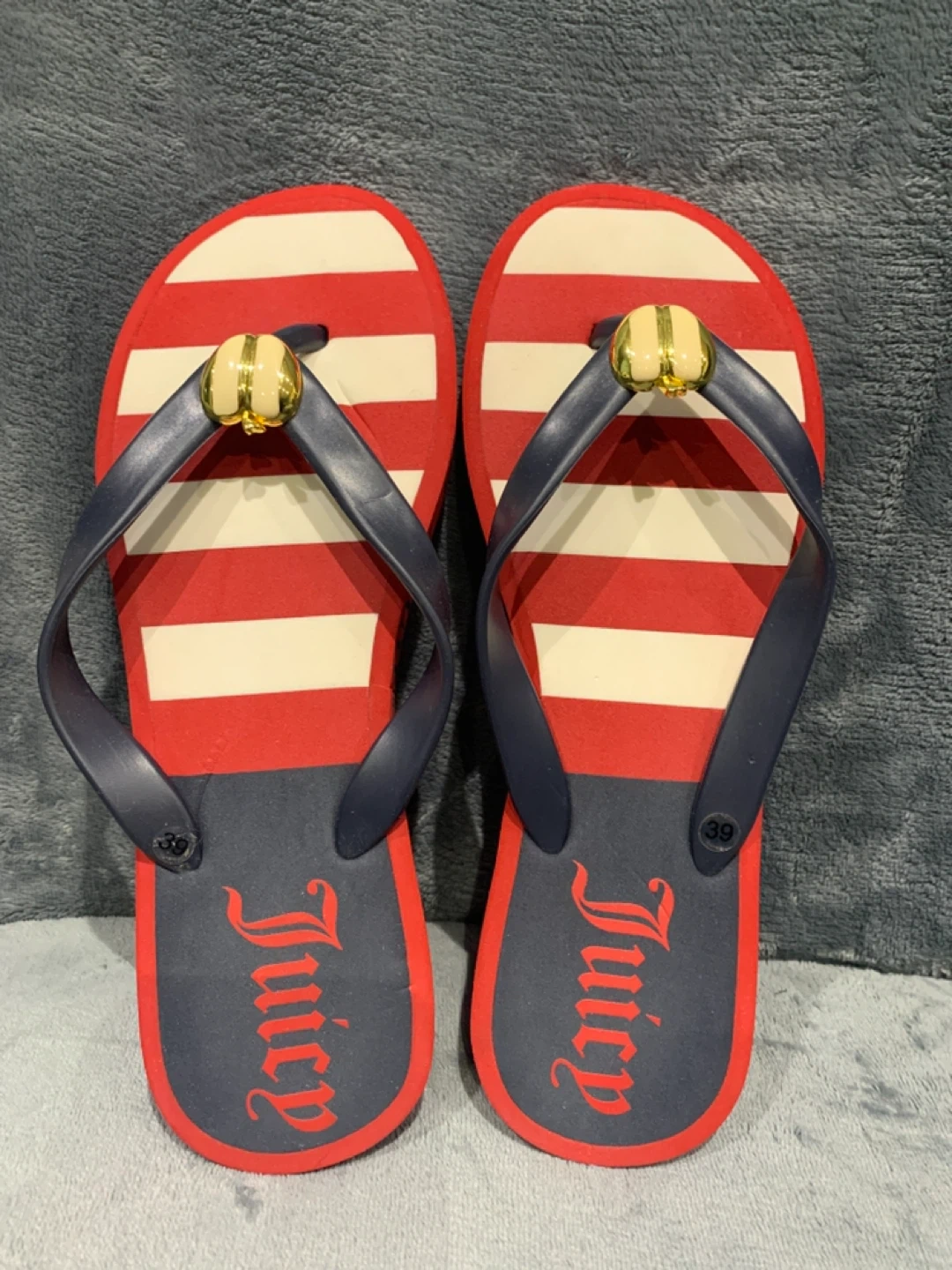 Juicy Couture flip flops with red and white stripes. Navy blue straps with gold accent. Soles show 'Juicy Couture' repeating pattern. Size is 39.