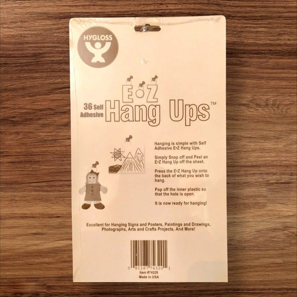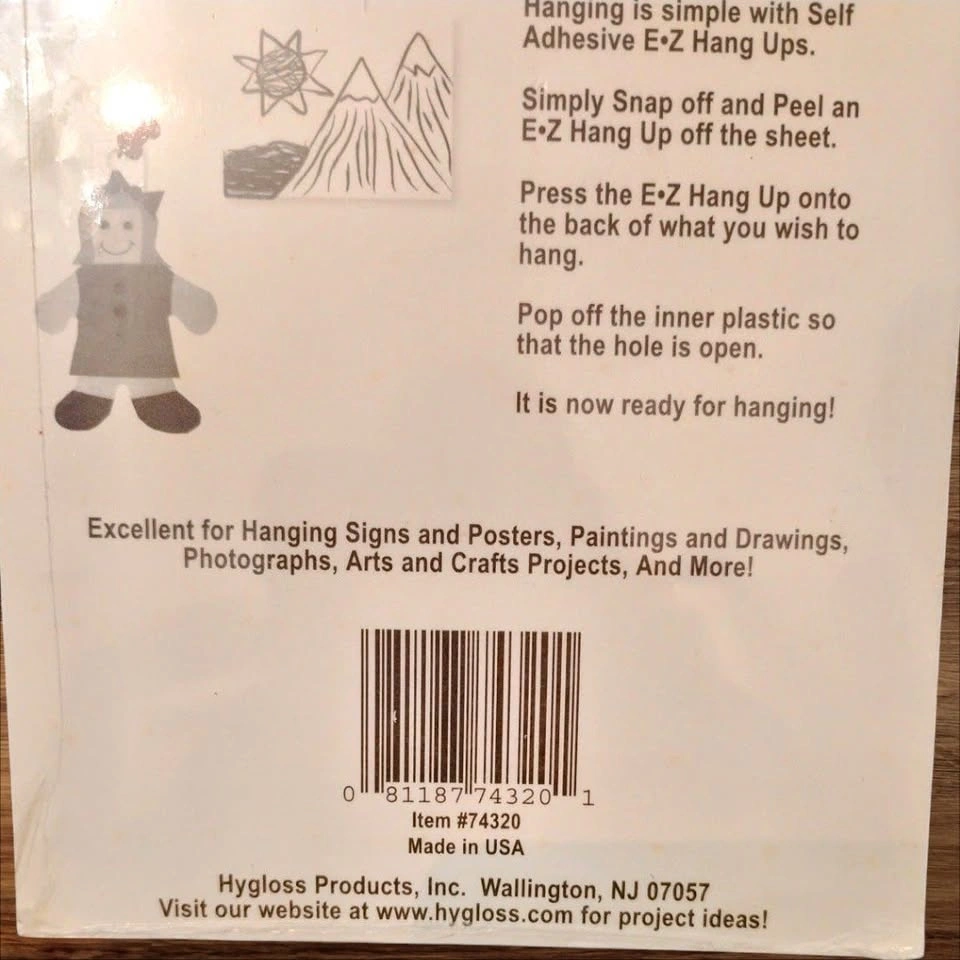 Hanging art projects and crafts is simple and easy with these Adhesive E-Z Hang Ups. Simply snap off and peel a self-adhesive hanger from its paper backing and press it on to the back of a paper or lightweight craft you'd like to hang. They are perfect for hanging signs, posters, paintings, drawings, photos, art and craft projects, and more. Vintage new old stock in shrink wrap. Pack of 36. Measure approx 7/8 in by 1 1/4 in.