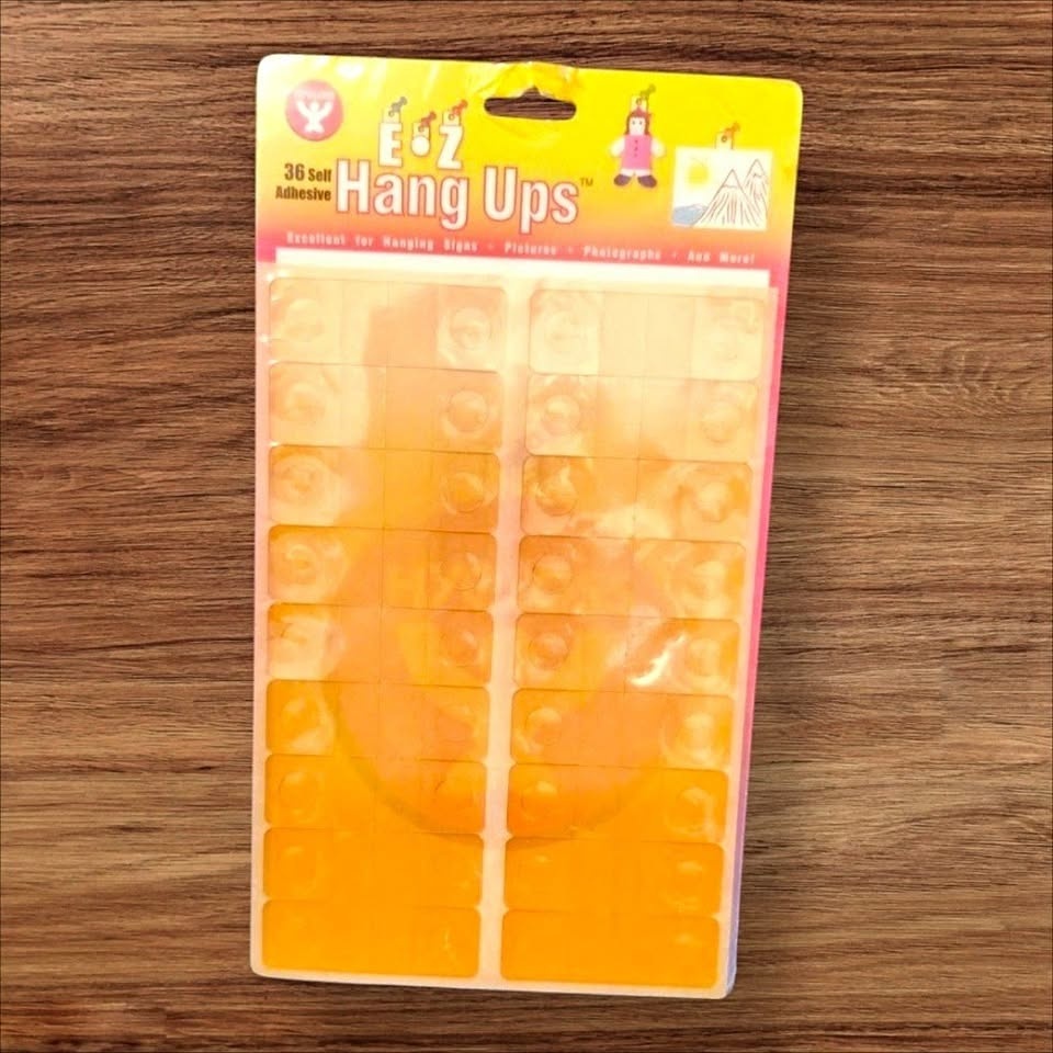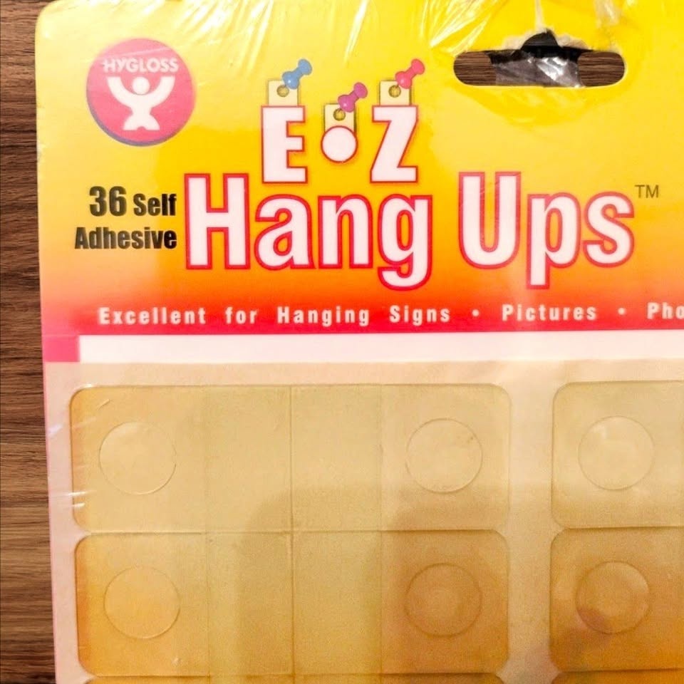Hanging art projects and crafts is simple and easy with these Adhesive E-Z Hang Ups. Simply snap off and peel a self-adhesive hanger from its paper backing and press it on to the back of a paper or lightweight craft you'd like to hang. They are perfect for hanging signs, posters, paintings, drawings, photos, art and craft projects, and more. Vintage new old stock in shrink wrap. Pack of 36. Measure approx 7/8 in by 1 1/4 in.