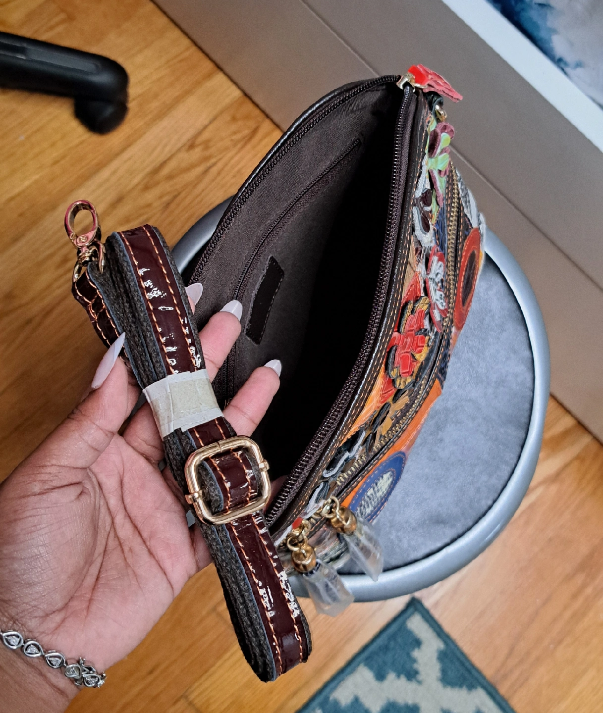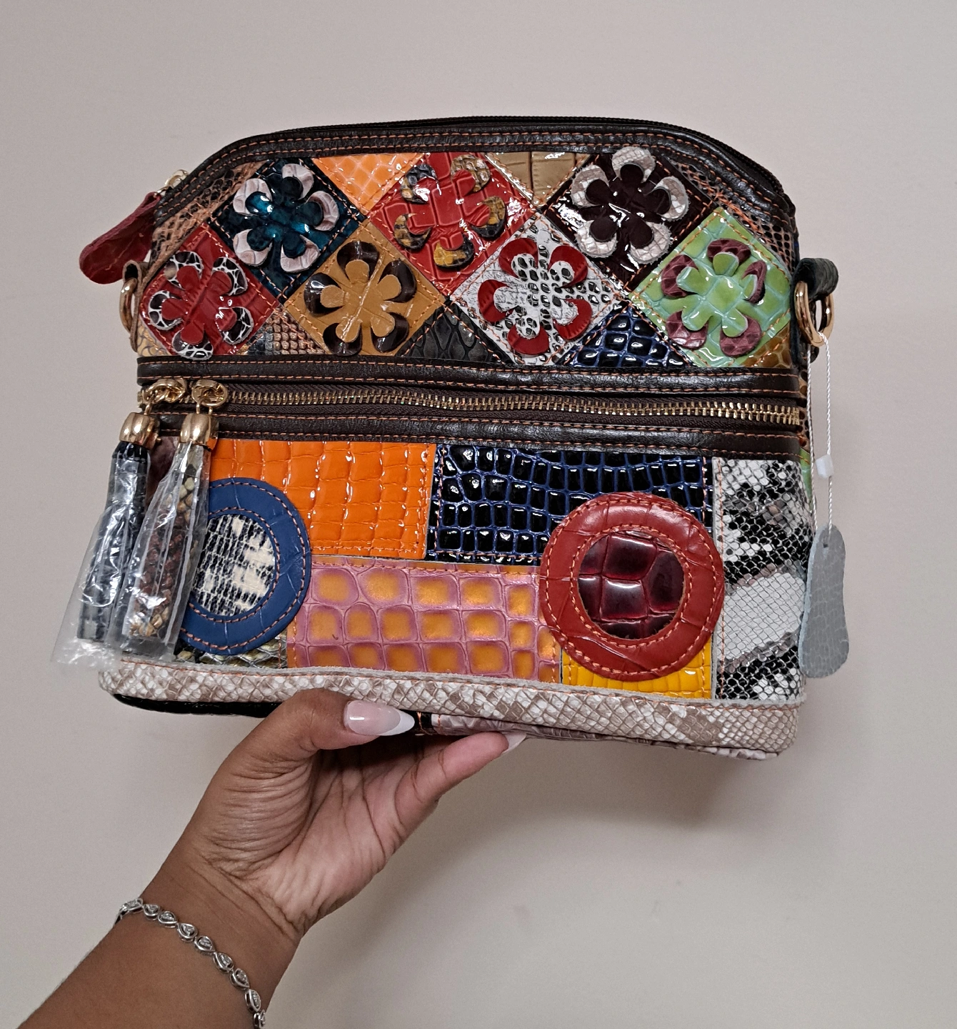 Check out this eye-catching crossbody bag! It features a unique patchwork design with various colours and textures of leather. It's in great condition and ready for a new home. Perfect for adding a pop of colour to any outfit!