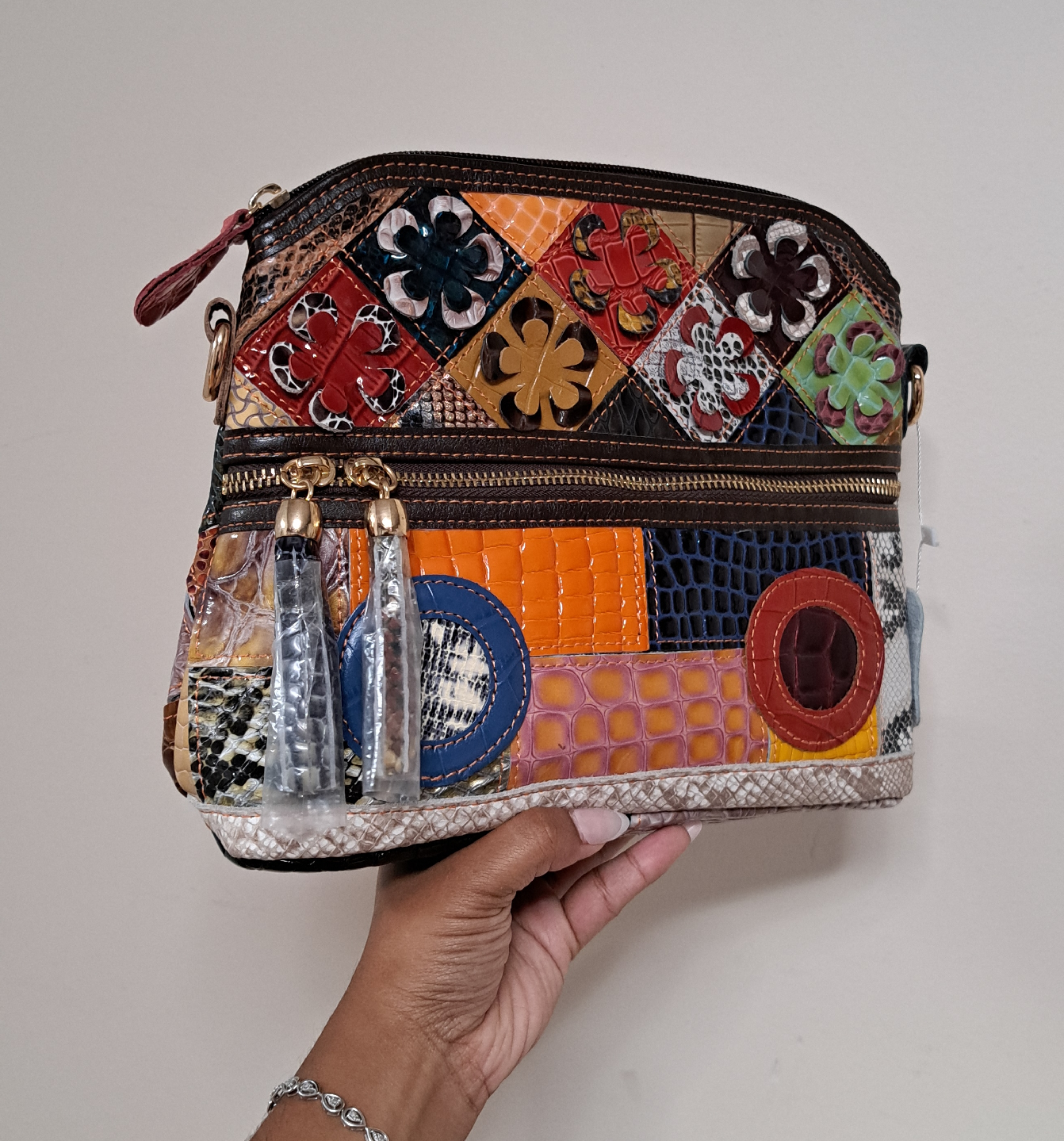 Check out this eye-catching crossbody bag! It features a unique patchwork design with various colours and textures of leather. It's in great condition and ready for a new home. Perfect for adding a pop of colour to any outfit!